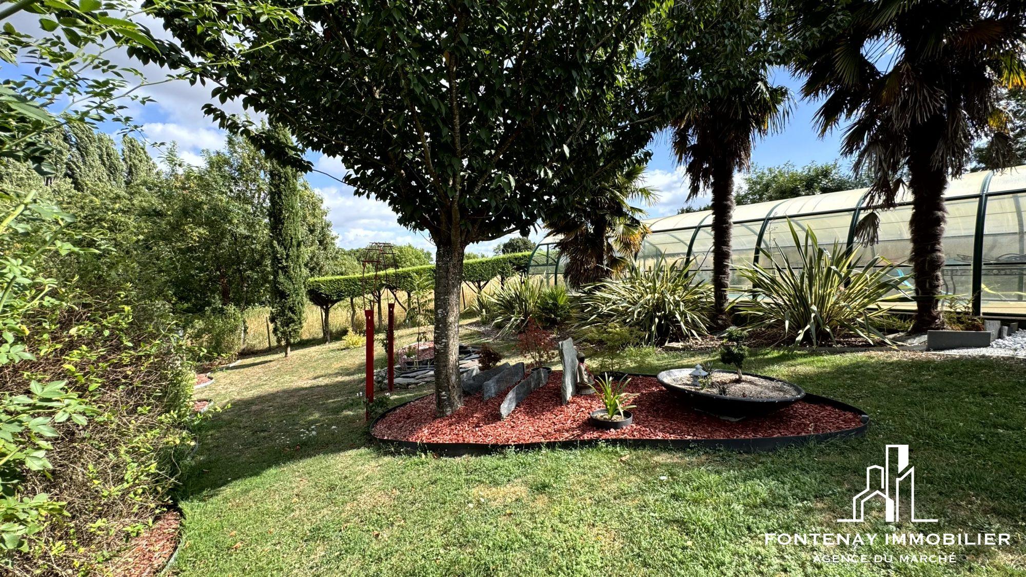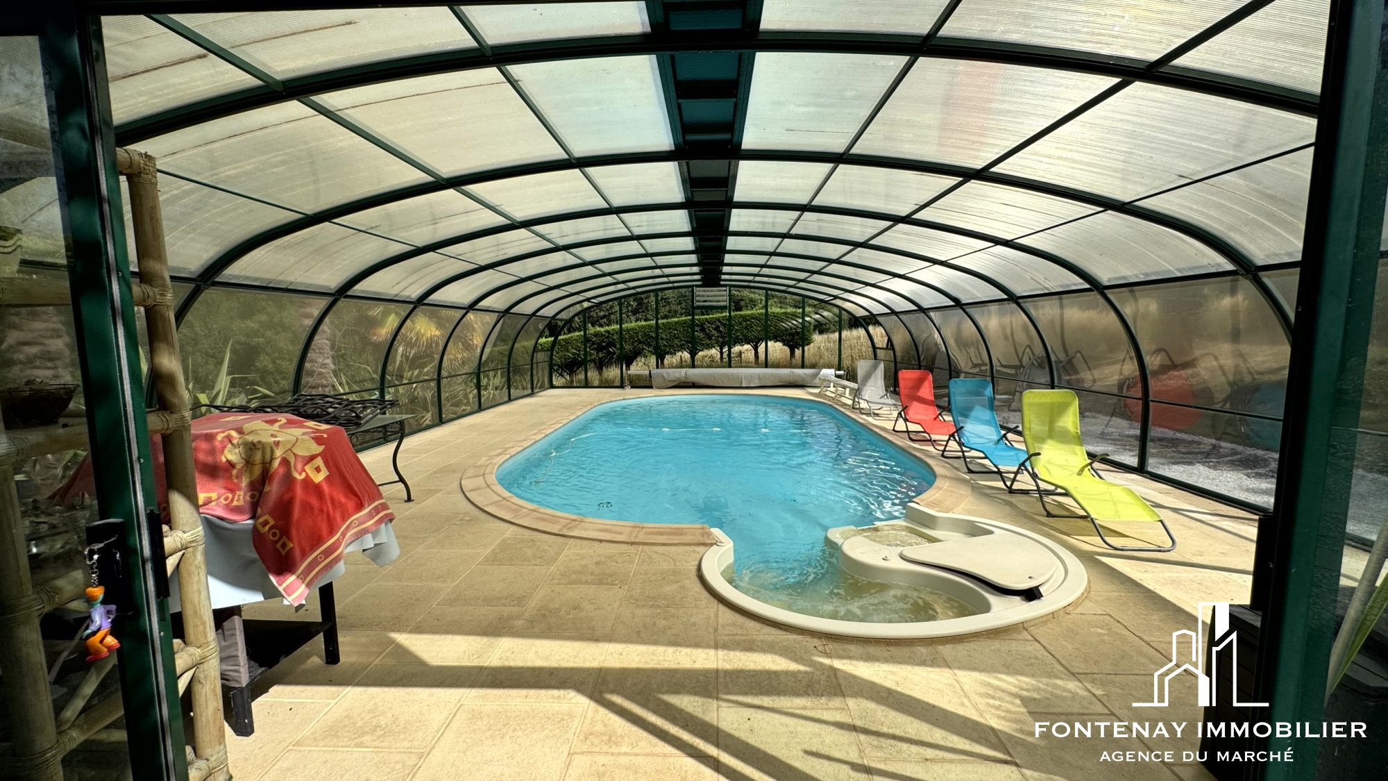 À l'extérieur, le terrain arboré de 3 852 m² est agrémenté d'une piscine couverte de 10 x 5 m et traversé par un petit ruisseau, apportant charme et fraîcheur à la propriété.