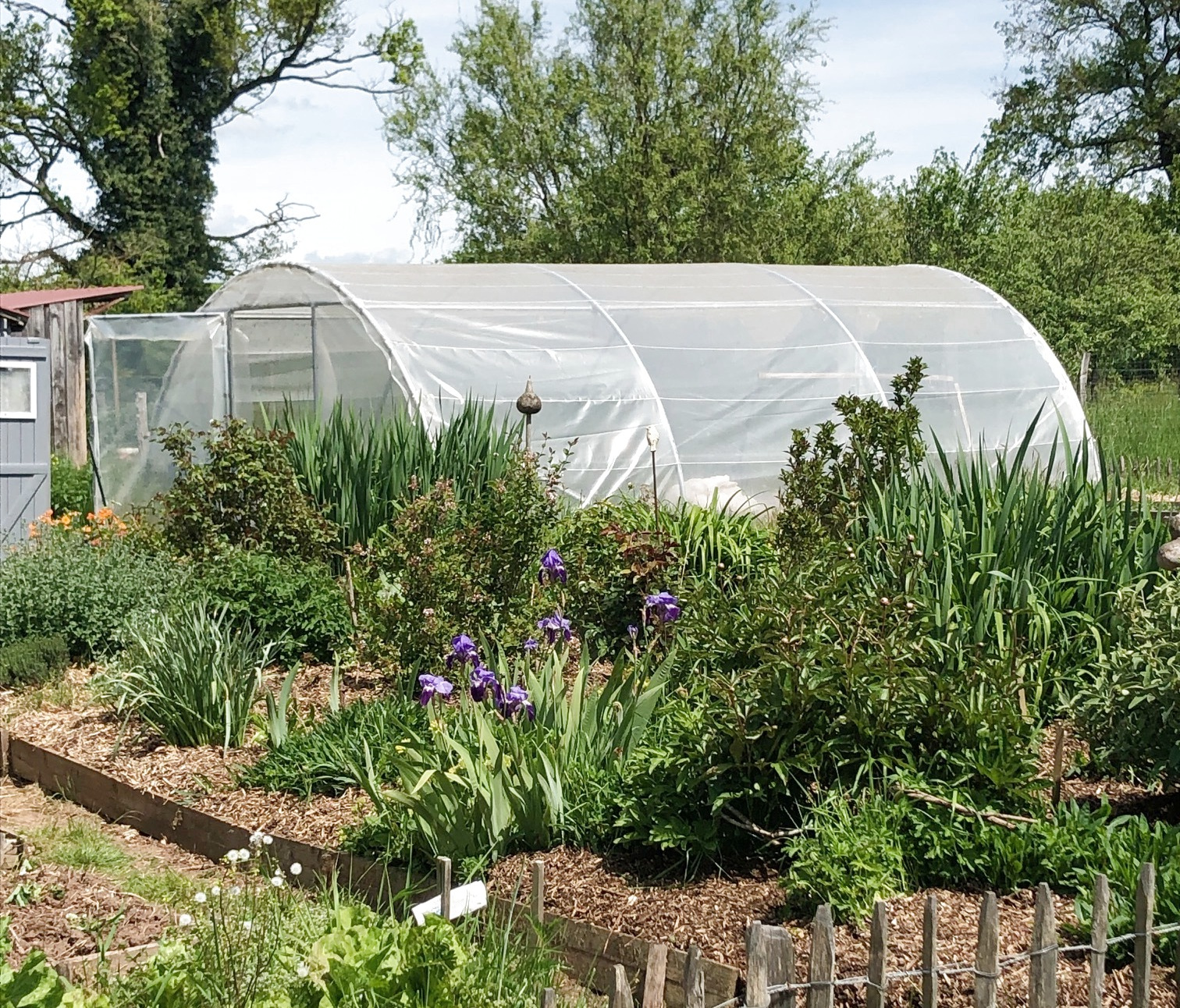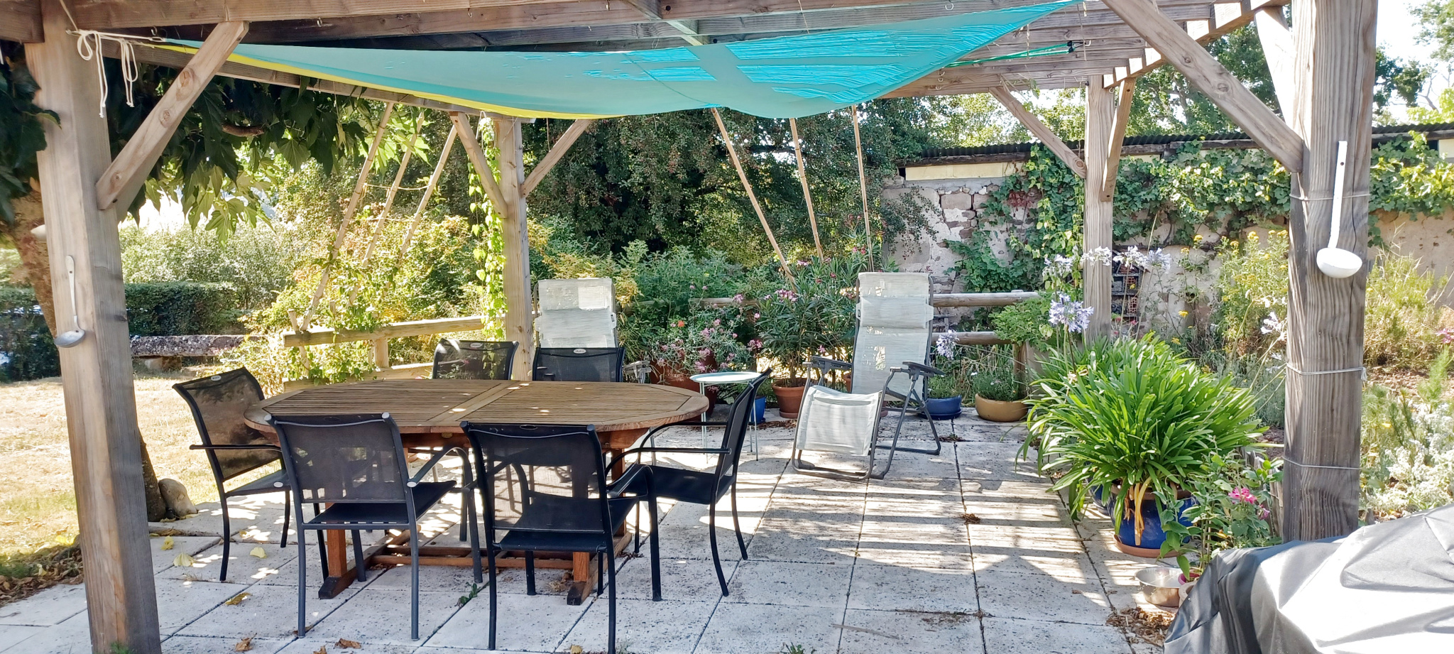 Sur le jardin, terrasse pergola dallée au milieu des fleurs et arbres et arbustes, jardin en perma-culture, verger et pré. Vue sur bocage environnant sans vis à vis. Charme et authenticité préservés, en pleine nature !
