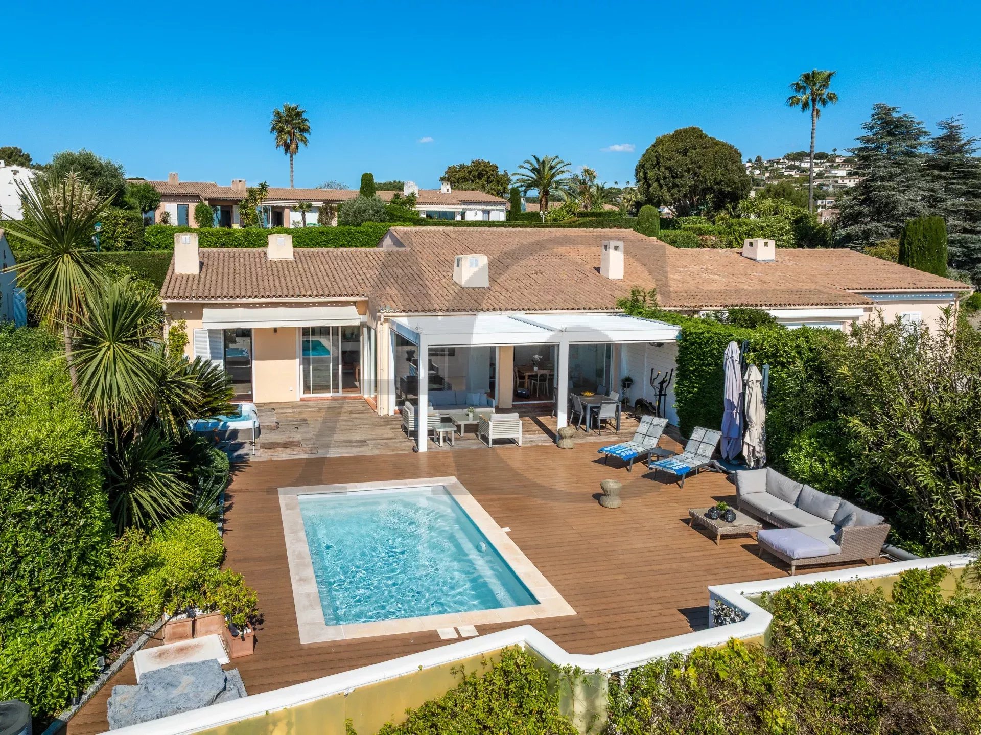 Dans le domaine des Hauts de Vaugrenier, Venez visiter cette somptueuse villa de plain-pied de 112 m², agrémentée de 35 m² d’annexes, baignée de lumière et sans vis-à-vis, offrant une vue imprenable sur la Méditerranée. Le spacieux séjour, ouvert sur une magnifique terrasse en bois composite, vous accueille avec une piscine et un jacuzzi pour 5 personnes. La véranda bioclimatique d'environ 27 m² vous offrira un espace de vie supplémentaire, agréable en toutes saisons. La cuisine, semi-indépendante et entièrement équipée, donne sur la salle à manger. La villa comprend trois chambres avec placards, dont une suite parentale avec salle d'eau et toilettes. Vous trouverez également une seconde salle d'eau avec toilettes et un WC indépendant. La grande buanderie de 17 m², équipée de placards, représente un véritable atout pratique. Les atouts de la villa : Excellente isolation (grenier et vide sanitaire) Climatisation réversible, volets roulants électriques Purificateur d'eau, éclairage extérieur, système d'alarme Porte de garage automatisée Piscine neuve (garantie décennale) de 5m x 3m, chauffée par pompe à chaleur télécommandée, avec système de nage à contre-courant Jacuzzi haut de gamme (Villeroy & Boch) pour 5 personnes Arrosage automatique, douche extérieure Ne laissez pas passer cette opportunité unique de vivre dans un cadre exceptionnel. Contactez-nous dès aujourd'hui pour organiser une visite ! Ce bien comprend : Un garage de 20 m² Un droit d'accès au Club Bien soumis au statut de la copropriété. Charges générales annuelles courantes : 3.060 € Aucune procédure en cours.