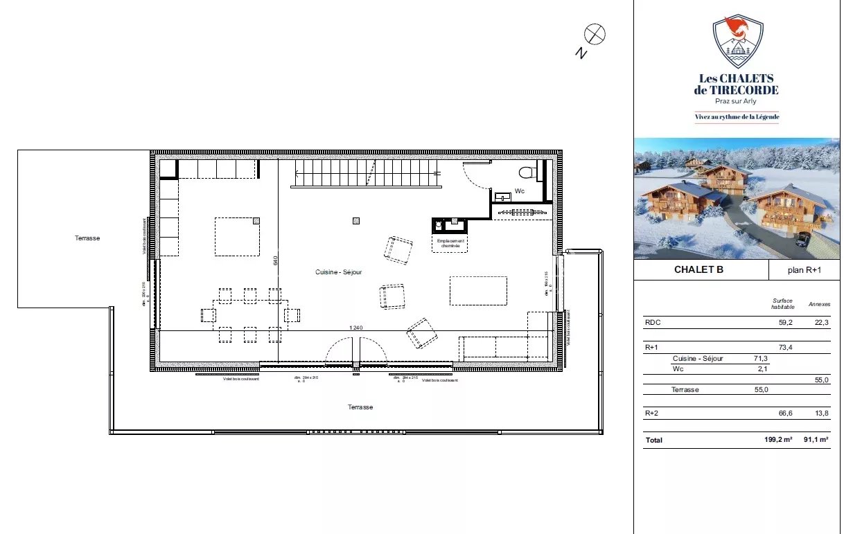 - Au 1er niveau : une grande pièce de vie lumineuse de 73m² avec une cuisine ouverte, un emplacement cheminée et un accès à une terrasse de 55m² exposée nord, ouest et est, un WC indépendant.