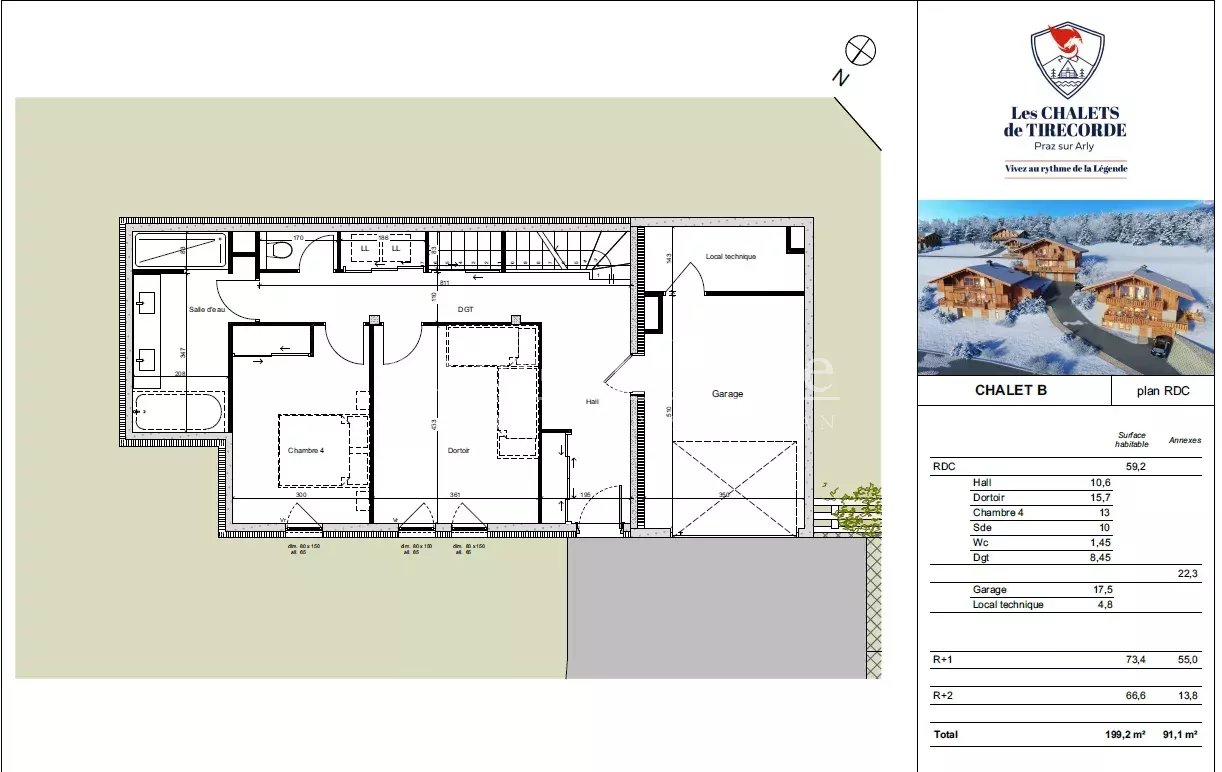 - Au RDC : une grande entrée, une chambre, une chambre dortoir, une salle de bains, une buanderie, un WC indépendant, un garage, un local technique.