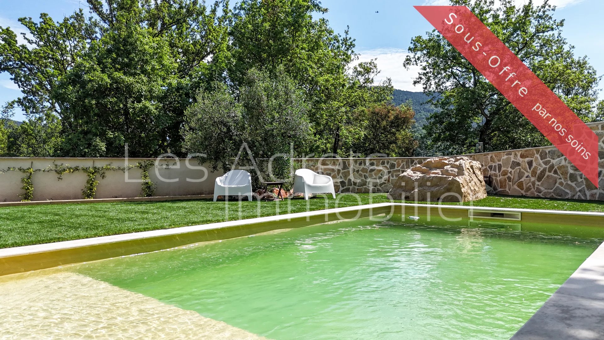 L’extérieur a été pensé pour la détente et la convivialité, avec une piscine et sa terrasse en travertin, ainsi qu’une cuisine d’été parfaitement aménagée.