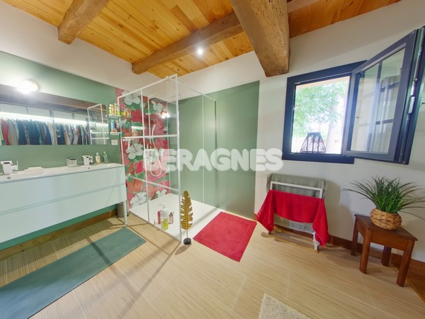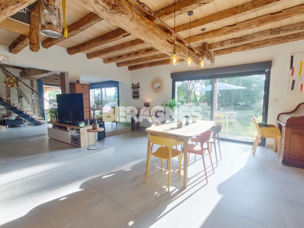 Esprit vacances, du charme, de l'élégance, de la pierre, de la modernité, du volume, de la luminosité, de l'espace, de la tranquilité, vue dégagée, du confort, aucun vis à vis, proche de la ville, économe en energie, pompe à chaleur au sol, double vitrage, etc....en un mot du beau. Quoi dire de plus? Simplement venez voir : triple séjour avec cuisine équipée et aménagée, cellier, chaufferie, cave, wc et sa très belle suite parentale (chambre, salle d'eau, wc et dressing). C'est une réalité. Elle est magnifique. En étage : petits, ados, amis, famille trouveront également leur nid : 3 chambres avec du beau parquet au sol, salle d'eau, wc. Les plus : terrasse couverte, piscine avec sa plage. Le plus plus : dépendance-hangar pour mettre à l'abri véhicules et/ou pour bricoler. Mon coup de coeur. Colette RIVALS BERAGNES IMMOBILIER 06 860 860 98