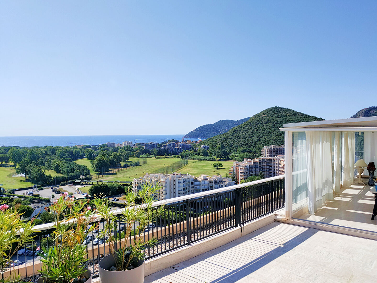Située dans une résidence de standing avec piscine et gardien, à quelques pas des commerces, du golf et de la mer, cette somptueuse villa sur le toit offre un cadre de vie rare et privilégié. D'une surface généreuse, l'appartement dispose d'un immense séjour baigné de lumière avec cuisine ouverte, d'un bureau (ou chambre), de deux chambres d'amis, d'une chambre aménagée en dressing, de deux salles d'eau avec WC, d'un WC indépendant, ainsi que d'une suite parentale avec dressing, salle de bain, douche et WC. A l'extérieur, une vaste terrasse équipée d'un jacuzzi vous invite à la détente, et une terrasse en duplex avec véranda offre un espace idéal pour un atelier d'artiste ou un bureau. La vue panoramique sur la mer, le golf et les collines environnantes complète l'exception de ce bien. L'appartement est en parfait état, climatisé, et vendu avec un garage fermé, une cave, ainsi que trois parkings extérieurs. Un bien rare à découvrir sans tarder. (5.91 % honoraires TTC à la charge de l'acquéreur.) Copropriété de 1467 lots - dont 618 lots habitation. Charges annuelles : 17400 euros.