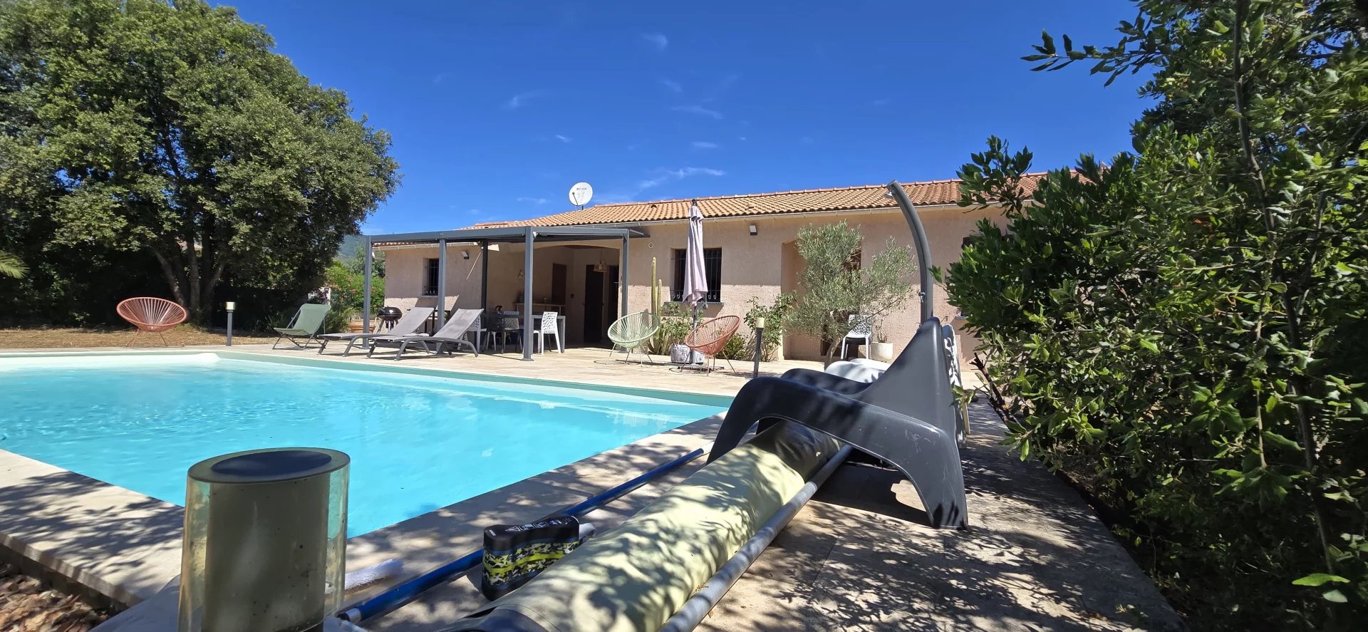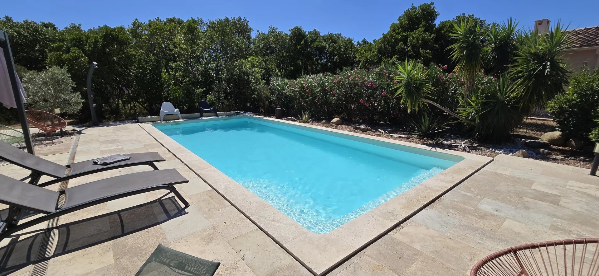 L'agence Panoramer immobilier vous propose cette très belle villa avec piscine d'une superficie de 85 m² sise sur un terrain entièrement clos de 1035 m² dans un secteur calme proche des commerces, collège et lycée . Elle est composée d'un hall d'entrée, une belle cuisine ouverte équipée sur séjour-salon, trois chambres, une salle d'eau, wc. Garage de 18 m² attenant. Piscine. Terrain clôt et arboré de 1035 m².