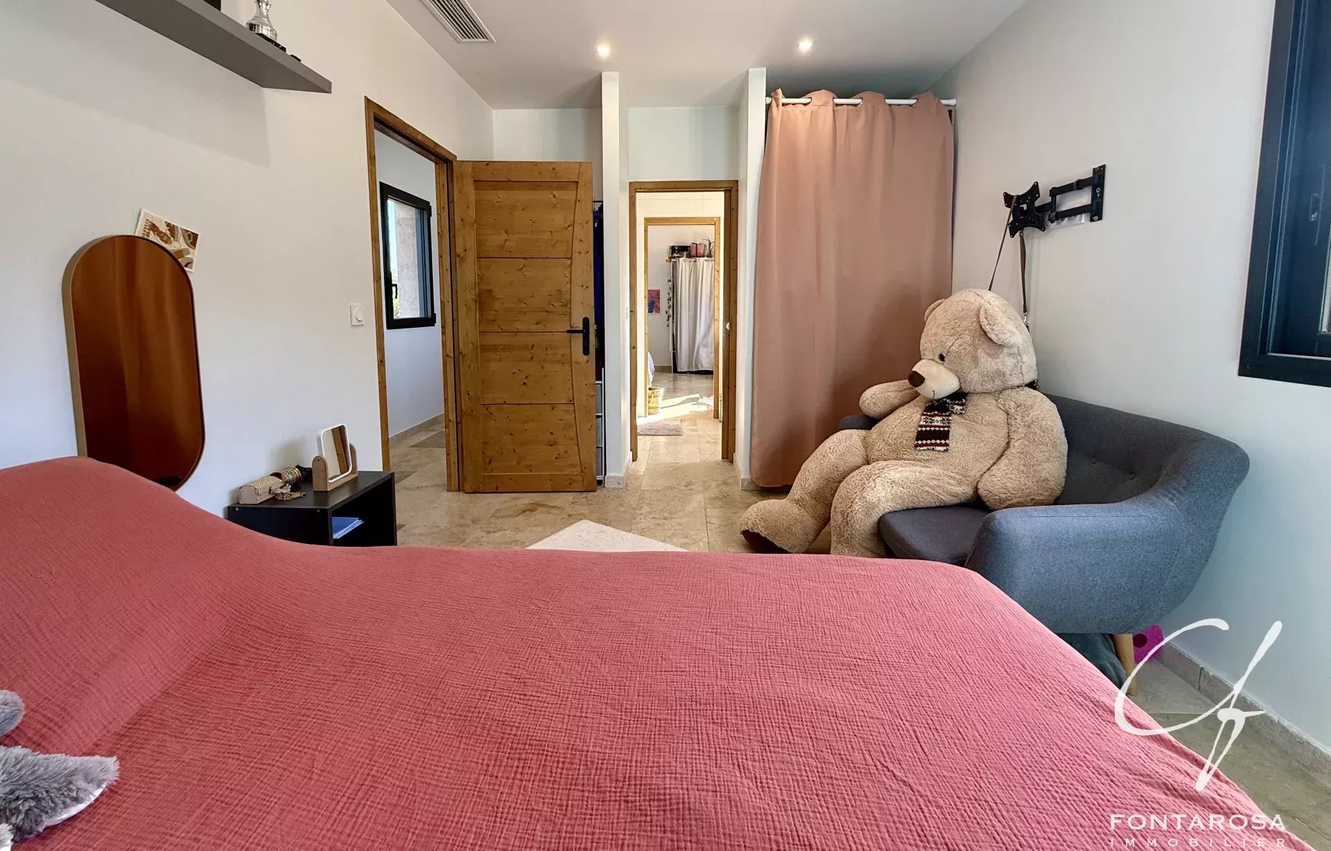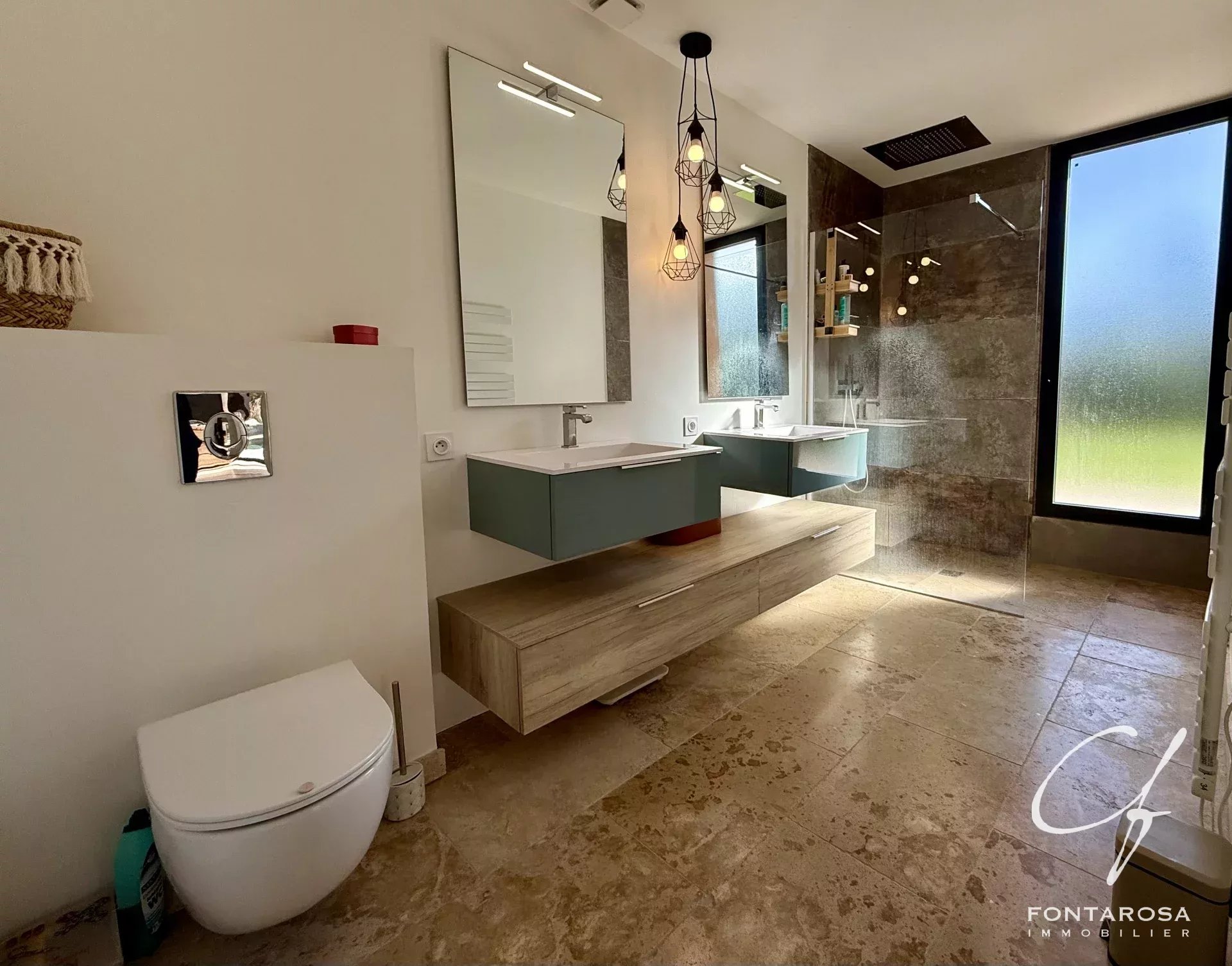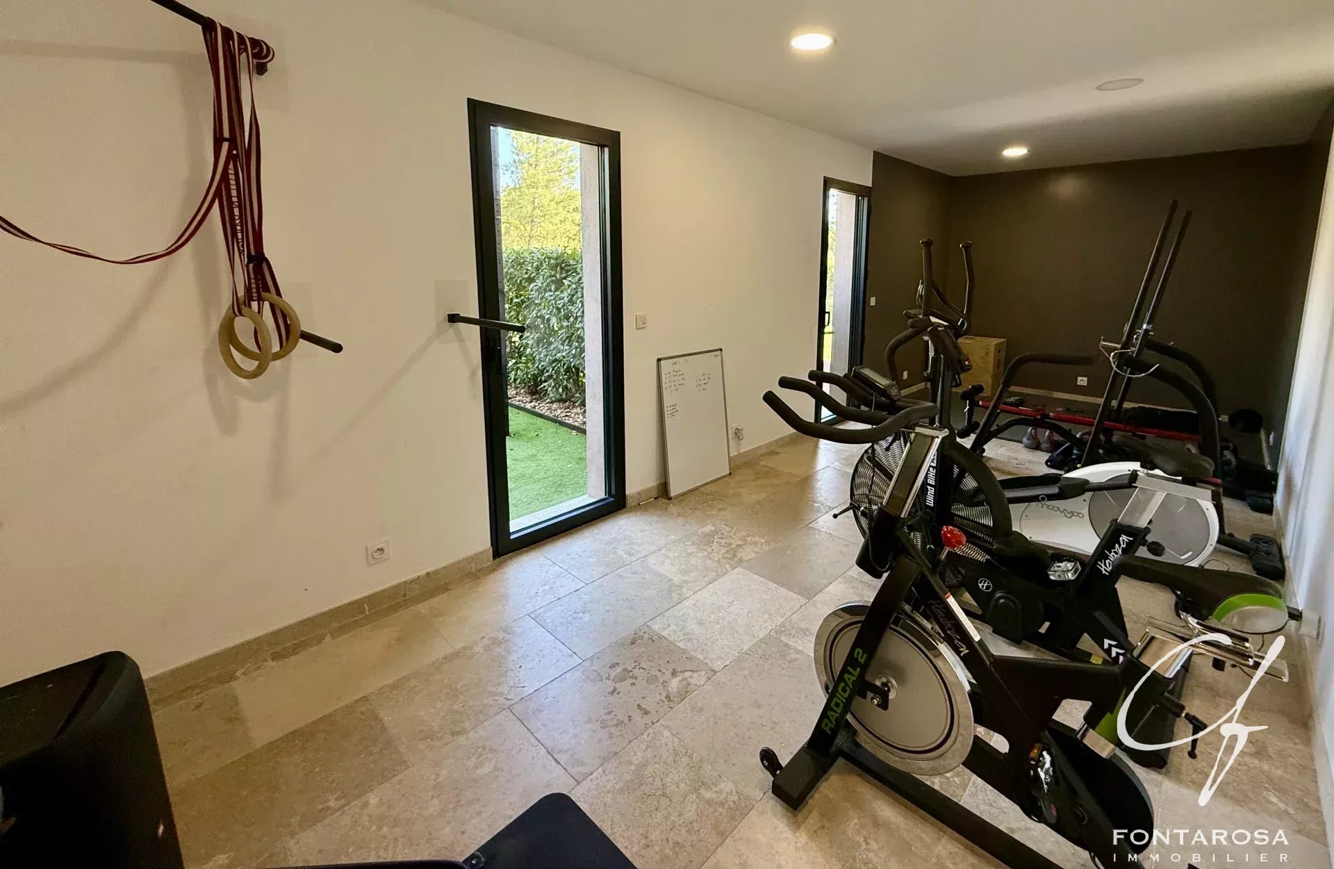 Con 289 m² di spazio abitativo, il piano terra presenta un'ampia zona giorno di 100 m² che comprende un salone con camino e una cucina a pianta aperta, oltre a una lavanderia, due suite, una palestra e un patio. Al piano superiore si trovano tre camere da letto, due bagni con doccia e uno studio che si apre su un solarium, perfetto per godersi il bel tempo. Un seminterrato di 290 m² completa la villa, con un garage per sei auto, una cantina e una sala giochi.