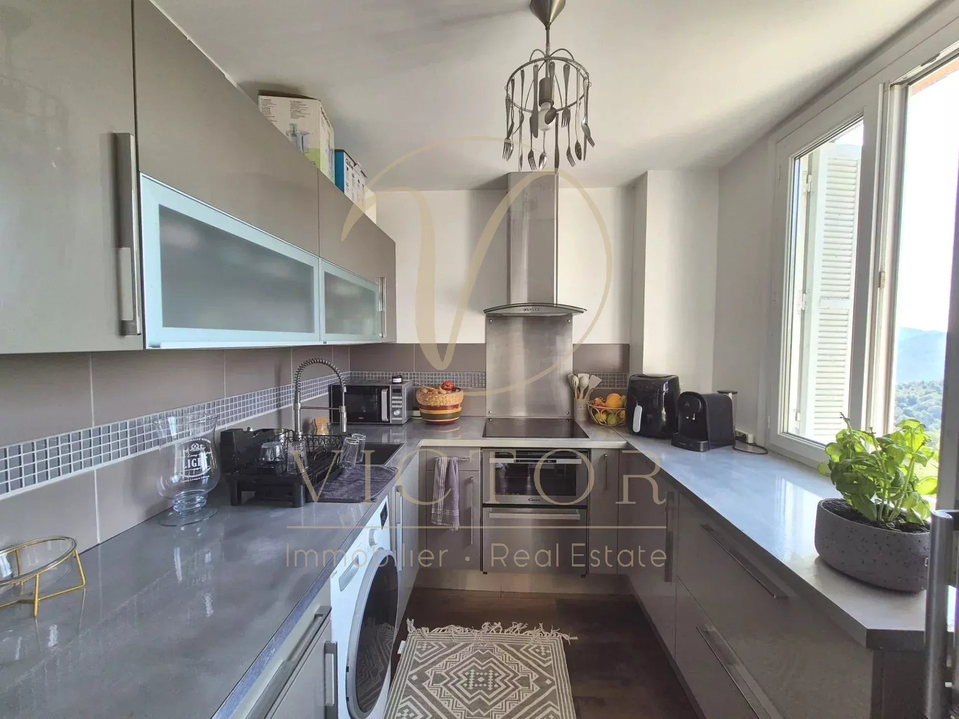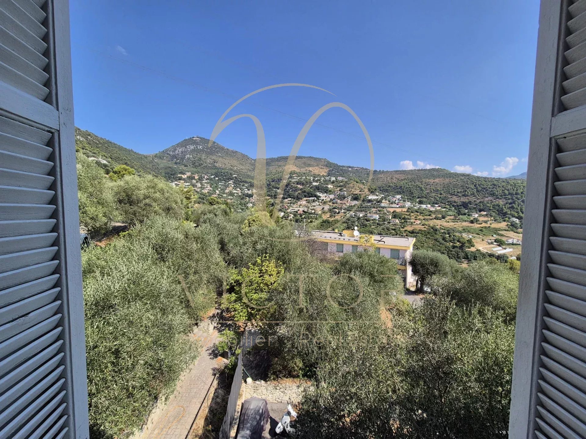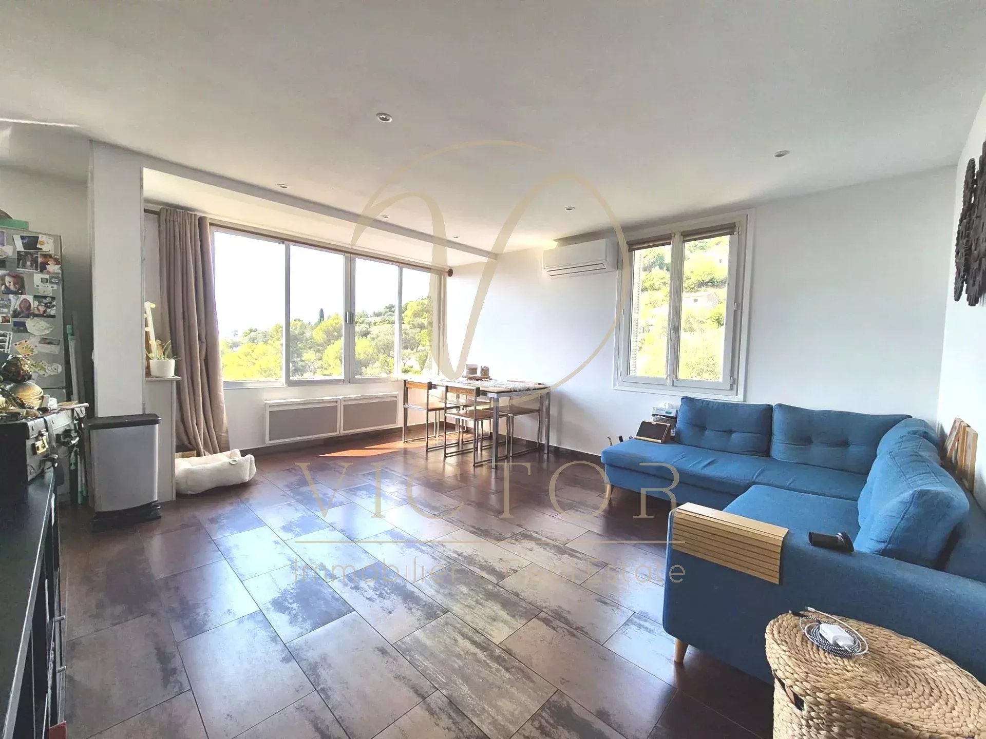 Dans une copropriété familiale. 3ème et Dernier étage, sans ascenseur, 3p de 56m² bien agencé et en bon état avec vue dégagée sur les collines sans vis à vis et baigné de lumière. Triple exposition: SUD, OUEST et NORD Composé comme suit: Entrée avec placards, séjour avec cuisine ouverte, 2 chambres, une salle de douche avec WC, une cave et 2 places de parkings privatives extérieurs. Au dessus de l'appartement, 61m² de combles avec 4,25m² au dessus de 1m80, à exploiter selon les besoins, poue ceux qu'ils veulent une terrasse, une terrasse tropézienne est faisable. Village de Falicon à 2min, bus et ramassage scolaires à proximité immédiate. Climatisation, porte blindée. Faibles charges 17€/mois - Foncier 850€. Honoraires d'agence à la charge du vendeur - les informations sur les risques auxquels ce bien est exposé sont disponibles sur le site Géorisques : georisques.gouv.fr