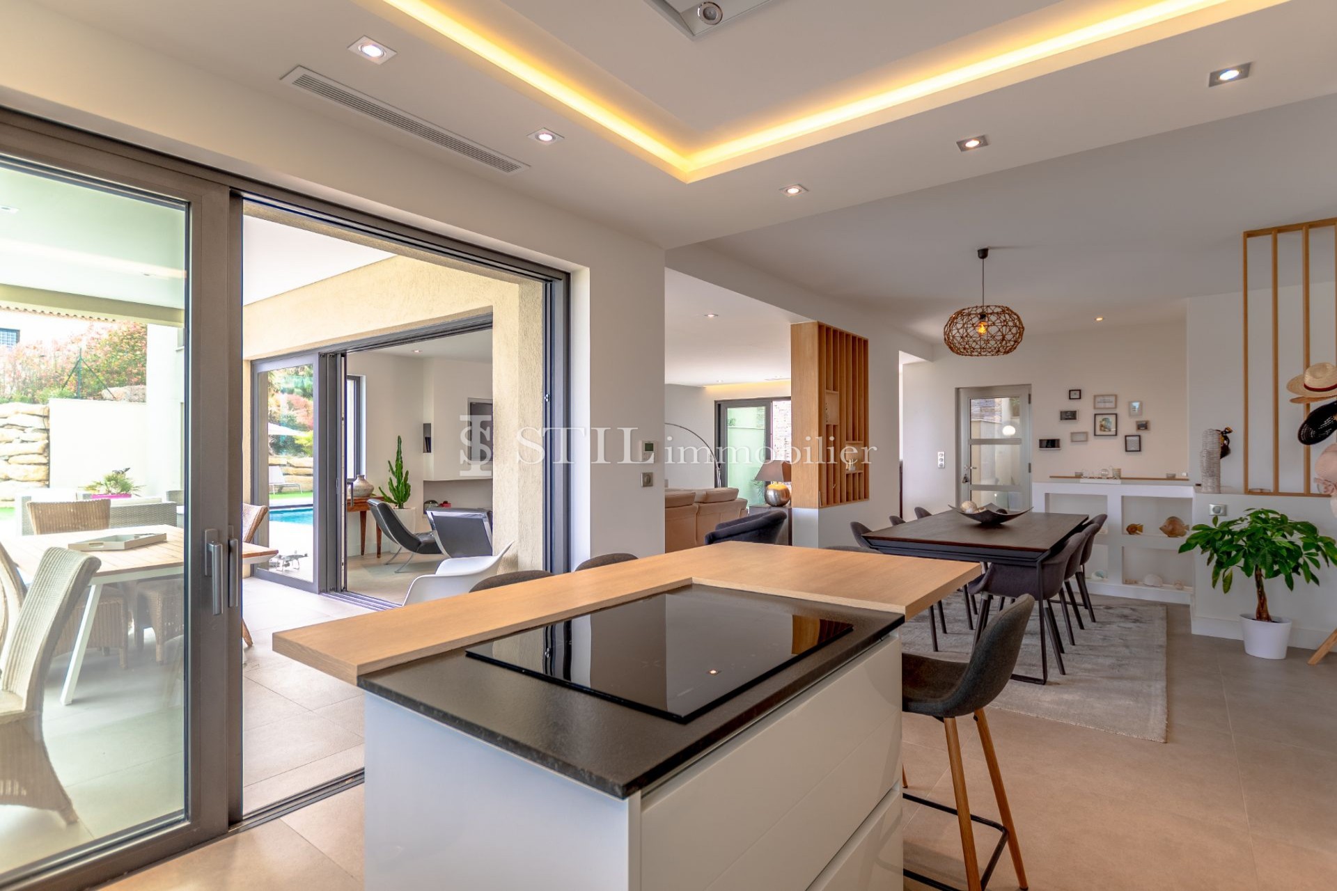 Location saisonnière Sainte-Maxime. Dans un domaine calme, à 2 pas de la plage de la Nartelle, superbe villa contemporaine construite avec des prestations haut de gamme. Avec une belle vue mer, elle offre : Hall d'entrée, vaste séjour salle à manger ouvrant sur terrasse, cuisine us équipée, 4 chambres en suites avec douche, wc et dressing. Garage. Une piscine agrémente le jardin joliment arboré.