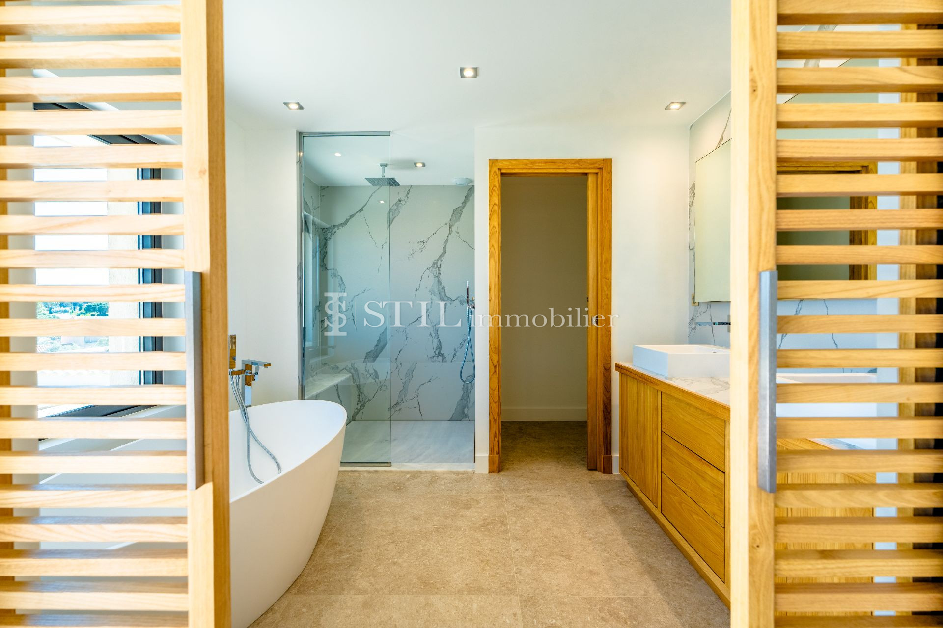 Vente villa Sainte-Maxime. Nichée dans un domaine sécurisé et paisible à proximité du centre-ville, cette magnifique villa neuve offre une superbe vue sur la mer et des finitions de luxe. Elle dispose d'un hall de réception, d'un grand séjour avec cheminée ouvrant sur une terrasse et un patio orné d'une fontaine. La cuisine ouverte est entièrement équipée, et l'arrière-cuisine comprend une chambre froide. La villa compte quatre suites, chacune avec salle d'eau et dressing, y compris une suite parentale exceptionnelle avec salle de bains, douche, dressing et solarium. Un grand garage, une salle de sport, un hammam et une cave à vins enrichissent encore plus cette demeure d'exception. Le jardin, agrémenté d'une piscine, est joliment paysagé. Profitez de frais réduits pour l'acquisition de ce bien d'exception.