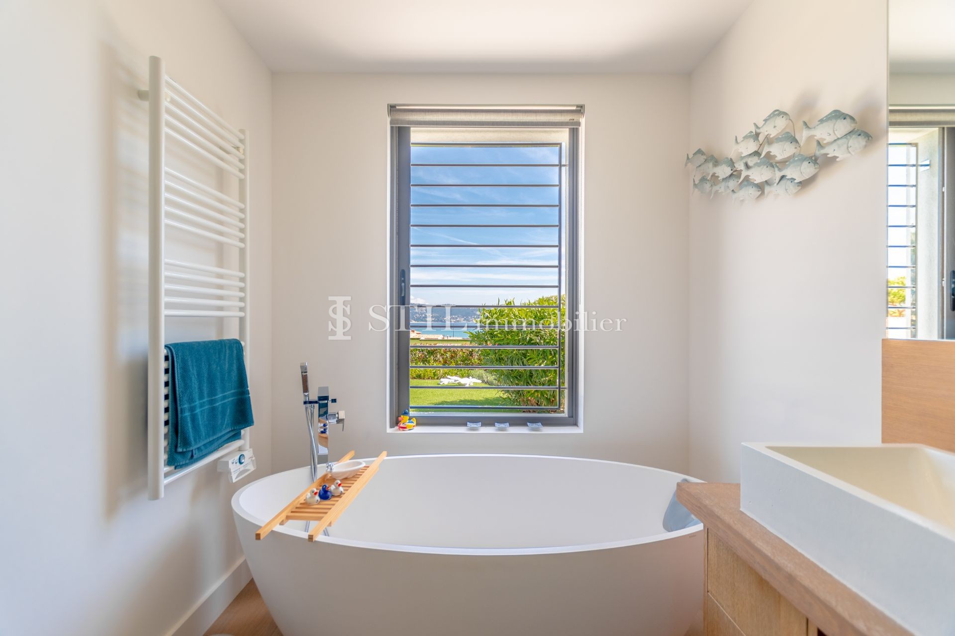 Vente villa Sainte-Maxime. A 2 pas des plages de la Nartelle, dans un secteur calme et résidentiel, magnifique villa contemporaine avec une belle vue sur la mer. Construite avec des matériaux de qualités, elle propose : hall d'entrée, wc invités, vaste séjour ouvrant sur de larges terrasses, cuisine us équipée et 3 chambres dont la suite parentale avec un grand dressing, salle de bains, 2 salles d'eau et bureau pouvant facilement devenir une quatrième chambre avec salle de bains attenante et wc. Salle de jeux avec bar, dressing d'hiver et magnifique cave à vins. Une piscine chauffée à débordement agrémente le jardin joliment arboré. Possibilité d'aménager une quatrième chambre avec salle de bains et wc ou de faire un appartement indépendant. À voir !