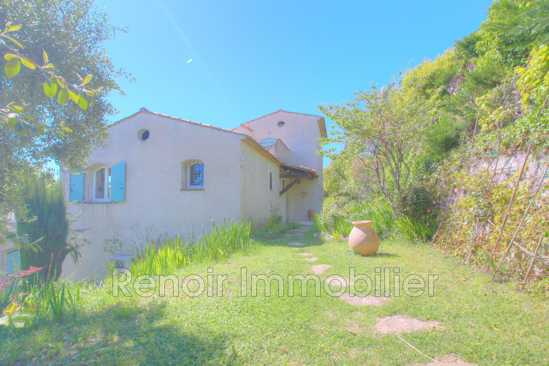 Le terrain clos, joliment paysagé et baigné de lumière, accueille une grande piscine au sel entourée de belles restanques fleuries. En retrait de la voie, la propriété profite d'une tranquillité rare et d'un voisinage discret.
