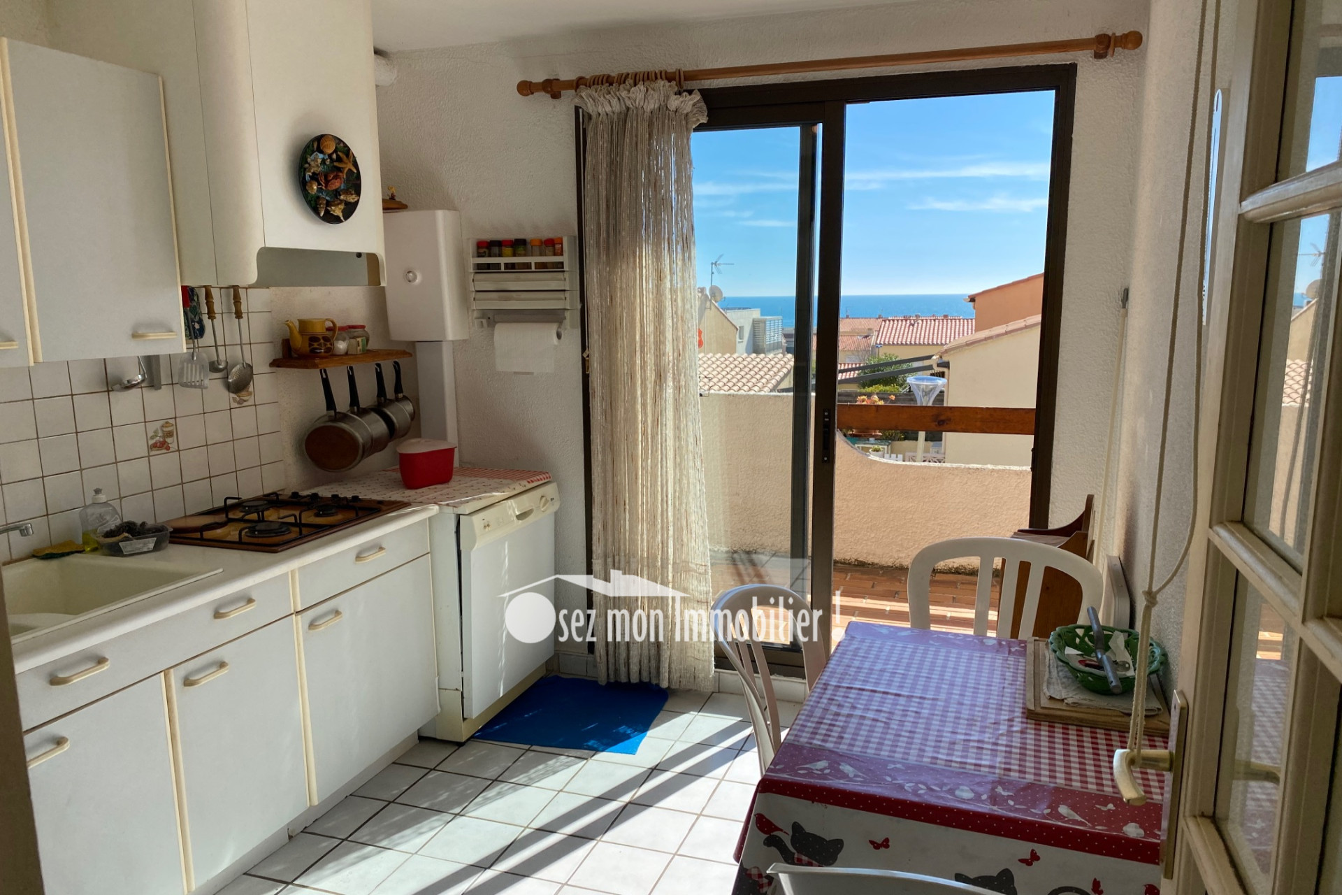 Retour à la vente: dans copro de 2 appartements, cet appartement traversant T3 de 50,43 carrez/ 61 m2 utile, sur 2 niveaux vous séduira par sa vue sur la mer, ses espaces fonctionnels, ses 2 terrasses à l'est avec vue et sa cour à l'ouest pour prendre vos repas, son emplacement au calme et proche des commerces et de la mer à pied. Sur 2 niveaux : coté rue, une belle cour avec entrée sur le séjour avec cheminée de 21 m2 , la cuisine séparée, partiellement équipée donnant sur la 1er terrasse vue mer. 1 wc séparé et sde. Au 1er étage : une grande chambre de 15,75 m2 donnant sur la 2ème terrasse dominant la mer. 5 marches et vous bénéficiez d'un espace aménagé de 10 m2 avec velux faisant office de chambre mansardée. Pk privé. Quelques remises au gout du jour, très bien isolé malgré les simples vitrages... Idéal pour vivre à l'année, location ou profitez de vos vacances à la mer... Pour visiter contactez Guylaine Bertrand 06.03.11.71.94