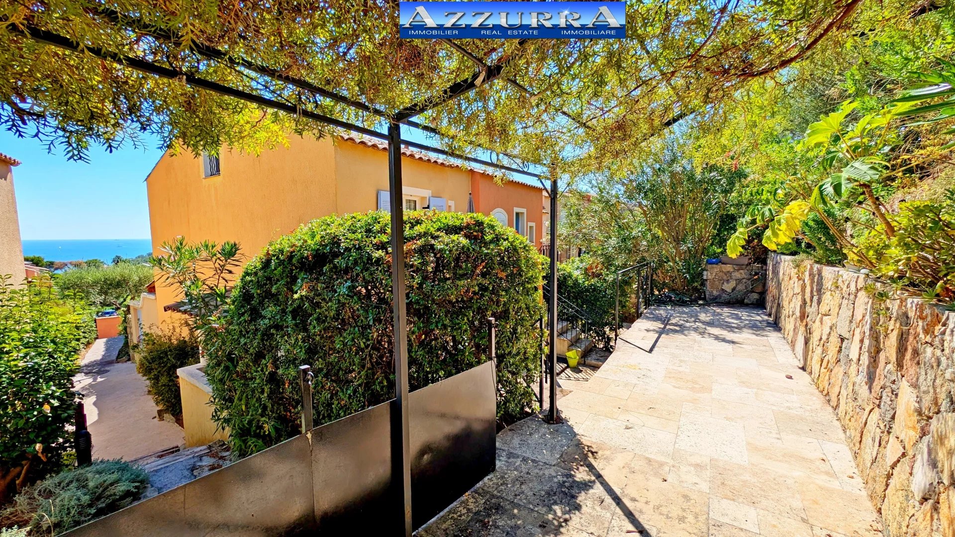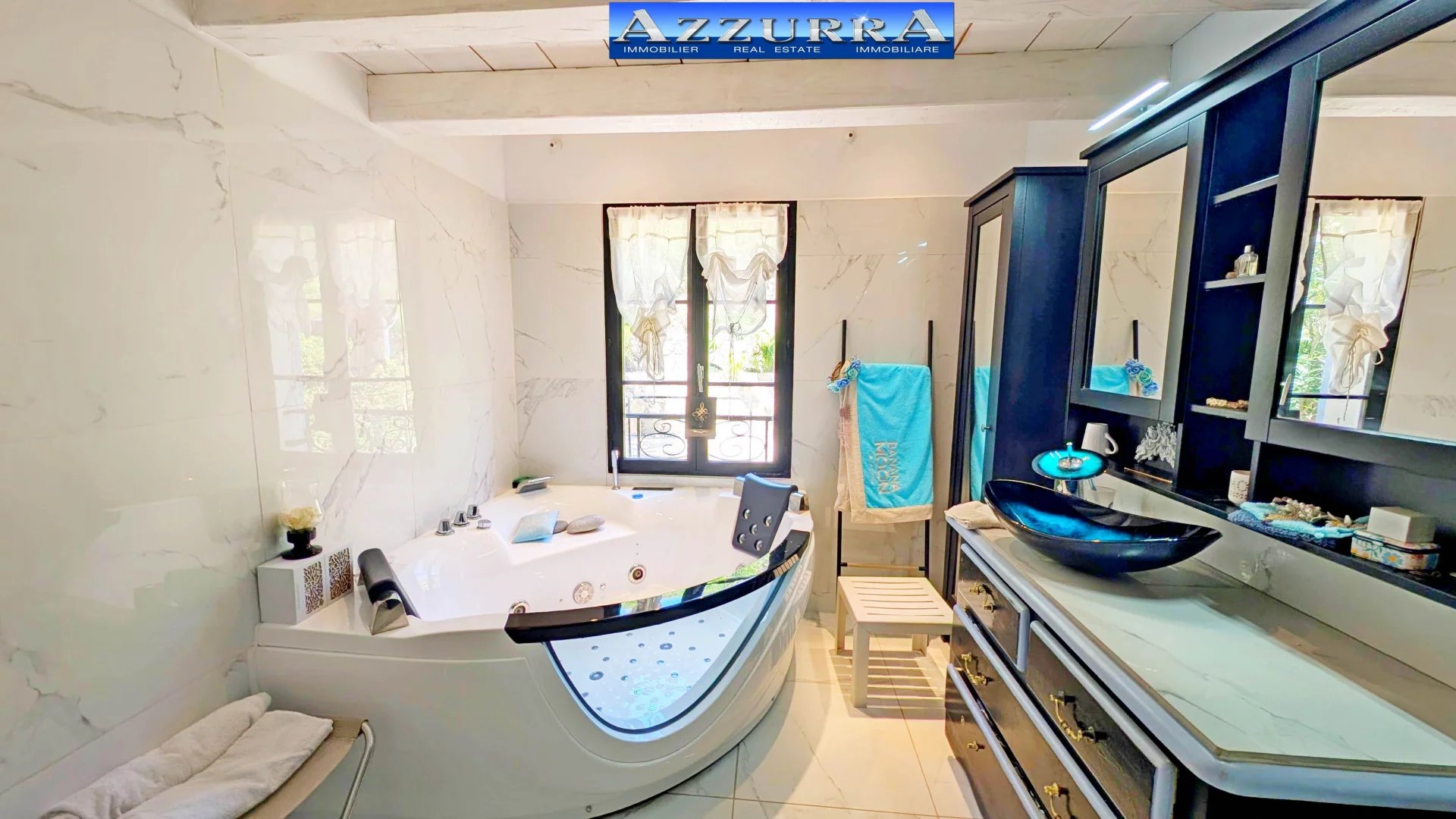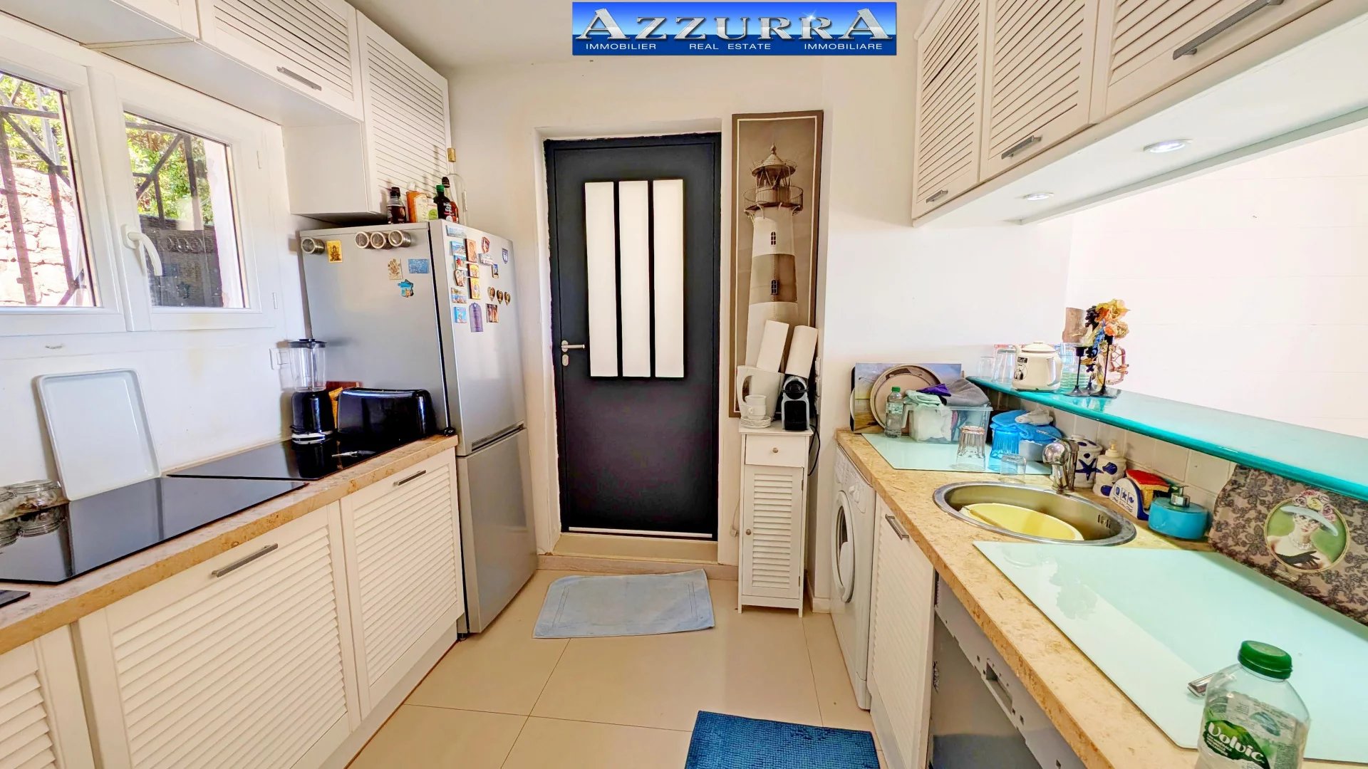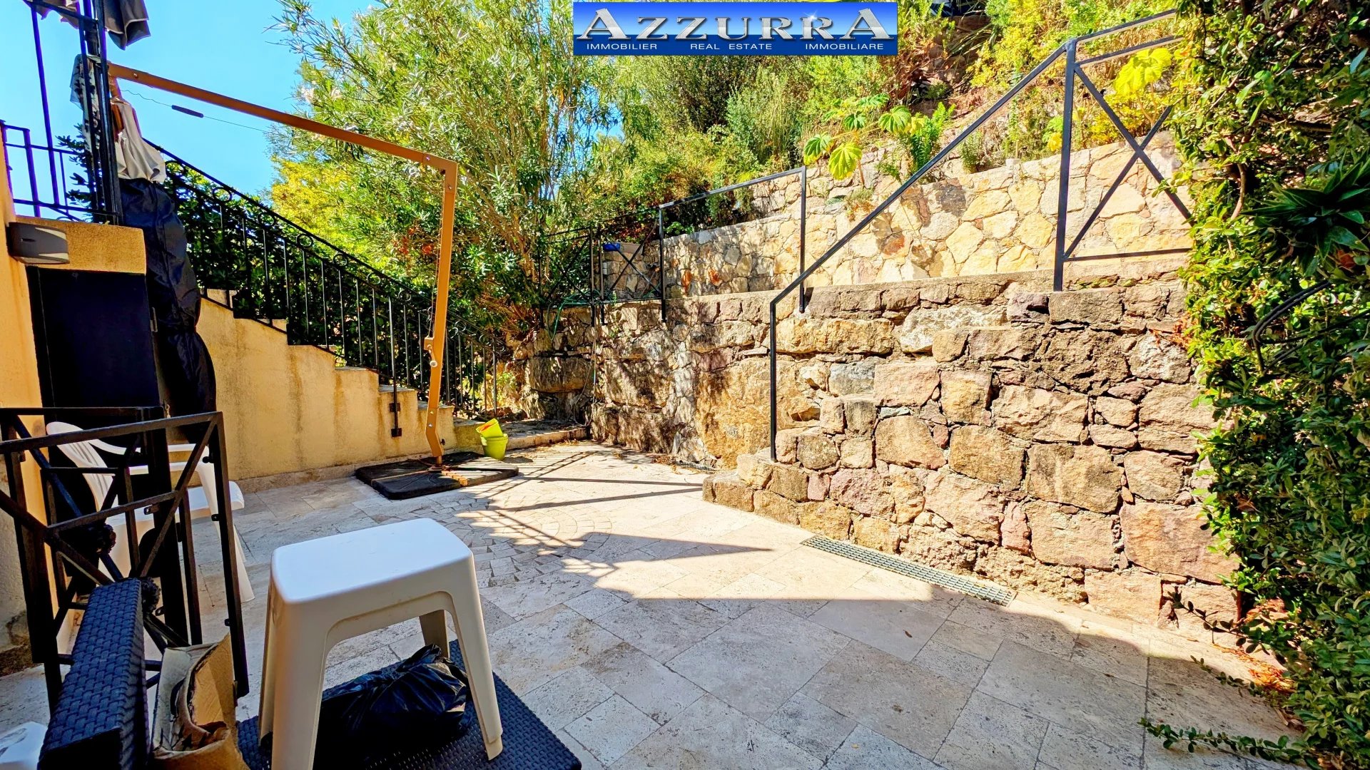 Entrée privée par le jardin, beau salon avec cuisine américaine entièrement équipée, WC avec lave mains. A l'étage deux belles chambres avec vue panoramique sur la mer, spacieuse salle de bains avec baignoire à remous, dressing, salle d’eau et WC. Dans le grenier un espace chambre/rangement. Plusieurs belles terrasses avec double exposition et vue panoramique dégagée à 360° sur la mer. Beau terrain de 250 m² en terrasses avec jacuzzi. Garage.