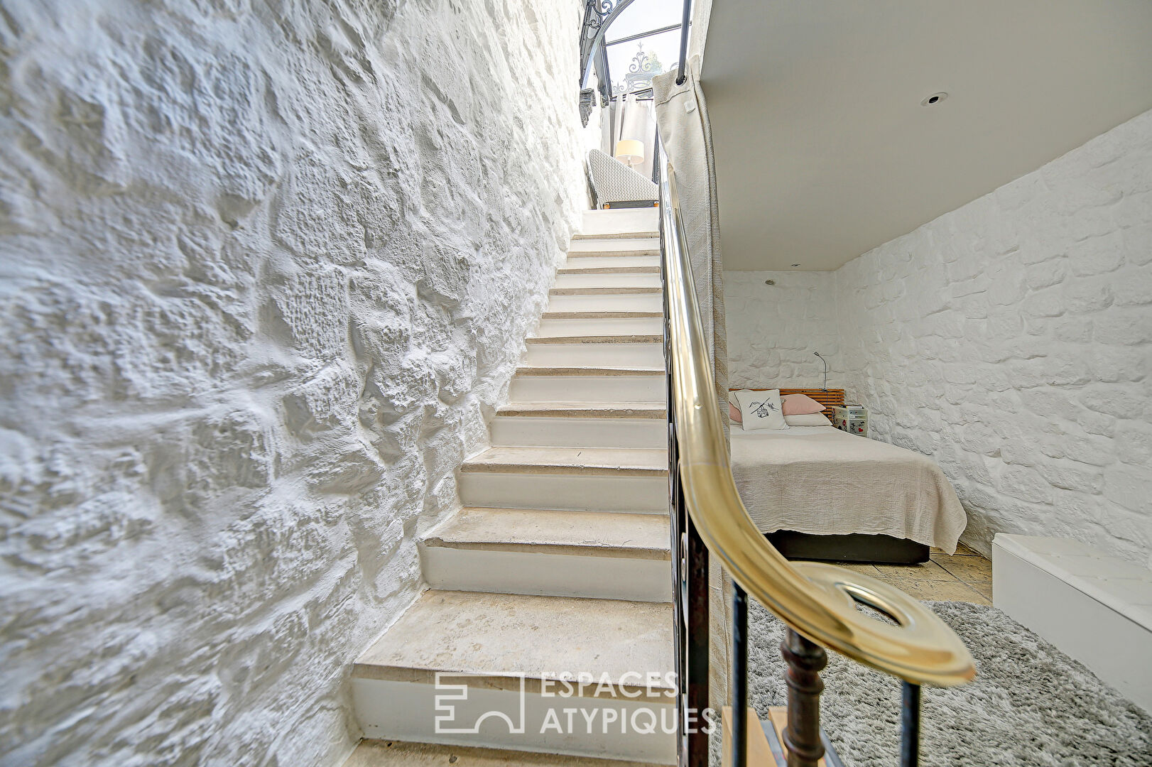 Ce magnifique souplex de 103 m² Carrez (112 m² au sol) avec sa terrasse de 39 m², au calme, est situé à mi-chemin du RER et du centre-ville de Rueil-Malmaison. L'entrée découvre une grande cuisine US avec sa partie dînatoire qui se prolonge sur l'espace salon, très lumineux sous une verrière Eiffel et s'ouvre sur la belle terrasse. Un WC indépendant se trouve à l'entrée. L'escalier mène au sous-sol entièrement réinventé avec ses murs en pierres et propose une partie chambre avec son petit salon/ bureau attenant. En prolongement, un grand espace dressing mène par un couloir à la grande salle d'eau avec WC de 12 m². La rénovation complète de ce niveau avec des matériaux de qualité et sa VMC double flux en font un nid douillet pour une suite parentale atypique de 43 m². Une deuxième chambre en enfilade pourrait prendre la place du petit salon. Une dépendance de 27 m², au bout de la terrasse, a été aménagée en un charmant petit duplex avec sa salle d'eau et WC ainsi que sa partie nuit en mezzanine, idéal pour un ado ou pour un bureau indépendant/chambre d'amis. Le calme, la proximité des commerces, du centre-ville et du RER A , la conception atypique assumée et la terrasse séduiront des amateurs avertis de biens rares non conventionnels. Commerces à proximité immédiate à pied (boulangerie, Monop, pharmacie) A deux pas du centre-ville Gare RER A Rueil : 15 min à pied, 8 min en bus Cinémas, théâtre André Malraux : 5 min à pied La Défense : 24 min en bus Ecole élémentaire Tuck-Stell : 3 min à pied Collège Marcel Pagnol : 10 min à pied Lycée Richelieu : 17 min en bus 467 Collège lycée Passy Buzenval et Danielou : 30 min en bus 467 CLASSE ENERGIE : E / CLASSE CLIMAT : E Montant moyen estimé des dépenses annuelles d'énergie pour un usage standard, établi à partir des prix de l'énergie de l'année 2021: entre 2030 euros et 2810 euros Copropriété de 7 lots Charges annuelles : 1800 euros Pas de procédures en cours Contact : Philippe 0668349509 RSAC : 828 047 704 Versailles Copropriété de 7 lots - dont 6 lots habitation. (Pas de procédure en cours). Charges annuelles : 2800 euros.