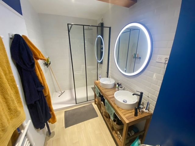Au premier étage un salon donnant sur une cour, un espace bureau, une chambre, une salle d'eau et un autre toilette.