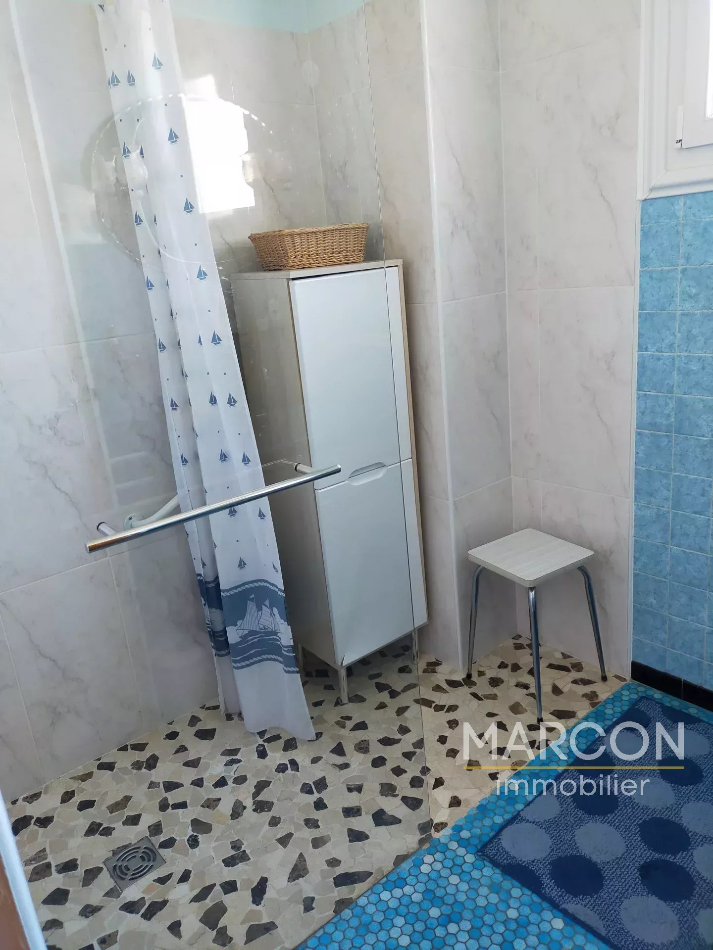 À l'étage : un palier équipé d'un placard dessert une cuisine aménagée, un séjour s'ouvrant sur un balcon, et trois chambres, dont deux équipées de placards muraux, une salle d'eau et des toilettes.