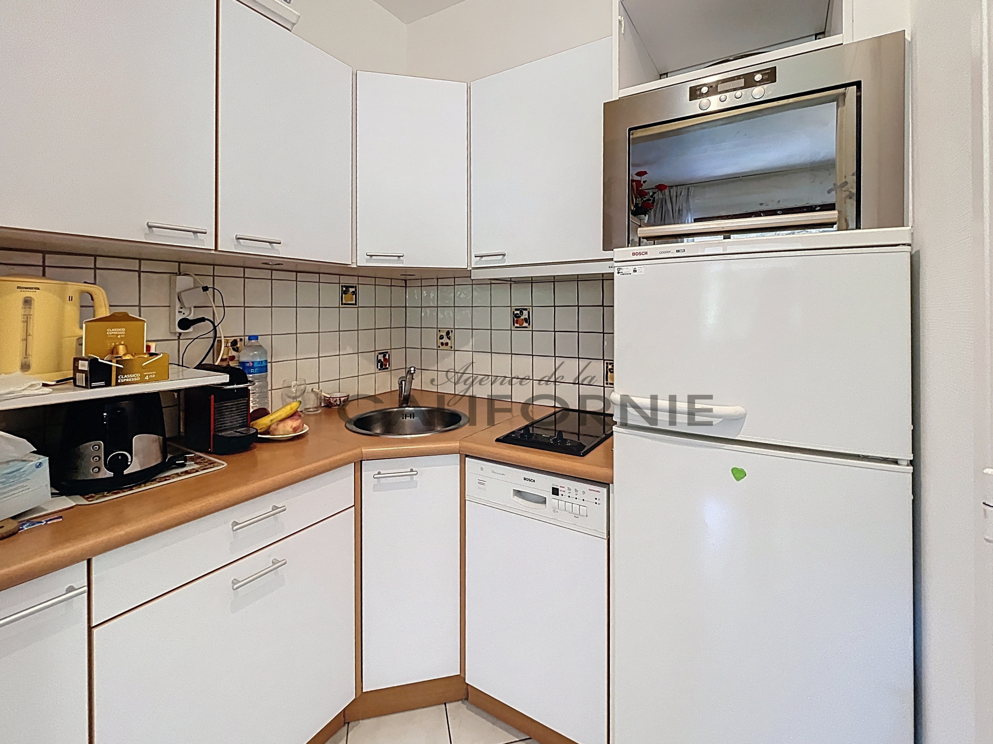 Dans une résidence de standing securisée avec parc, gardien, joli 2 pièces disposant d'une entrée, un séjour avec une cuisine ouverte, une chambre, une salle d'eau et un WC invité.