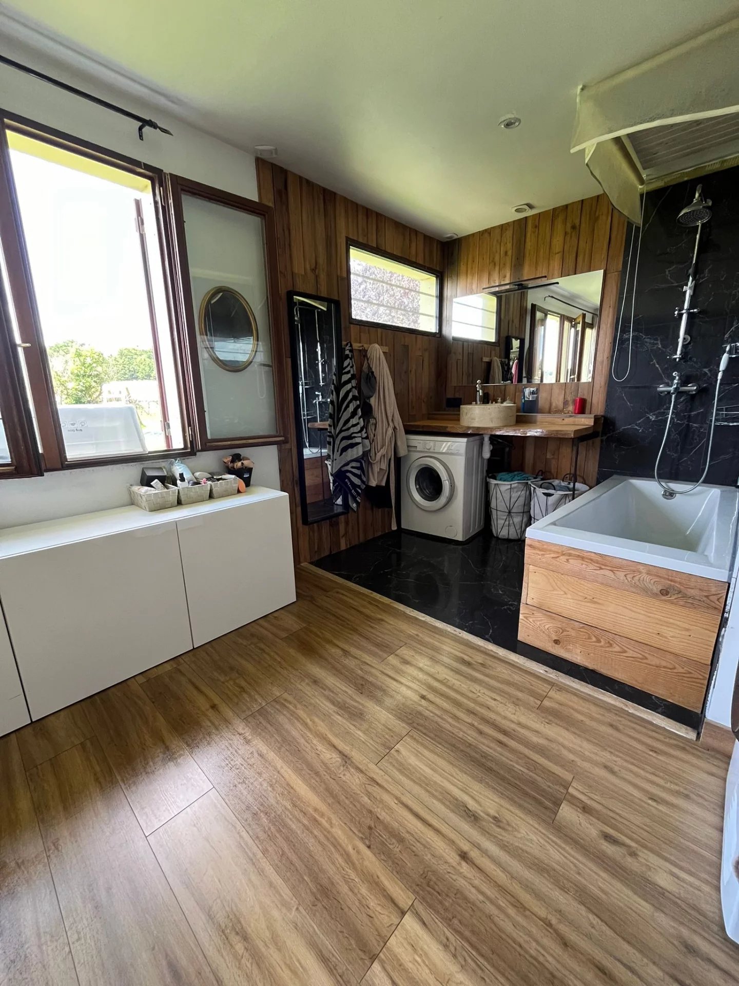 Un atout majeur de cette propriété est son grand garage ainsi qu'une pièce aménagée attenante. Cette dernière offre de multiples possibilités : elle peut servir de chambre d'amis, recevoir votre activité professionnelle ou d'espace dédié au télétravail.