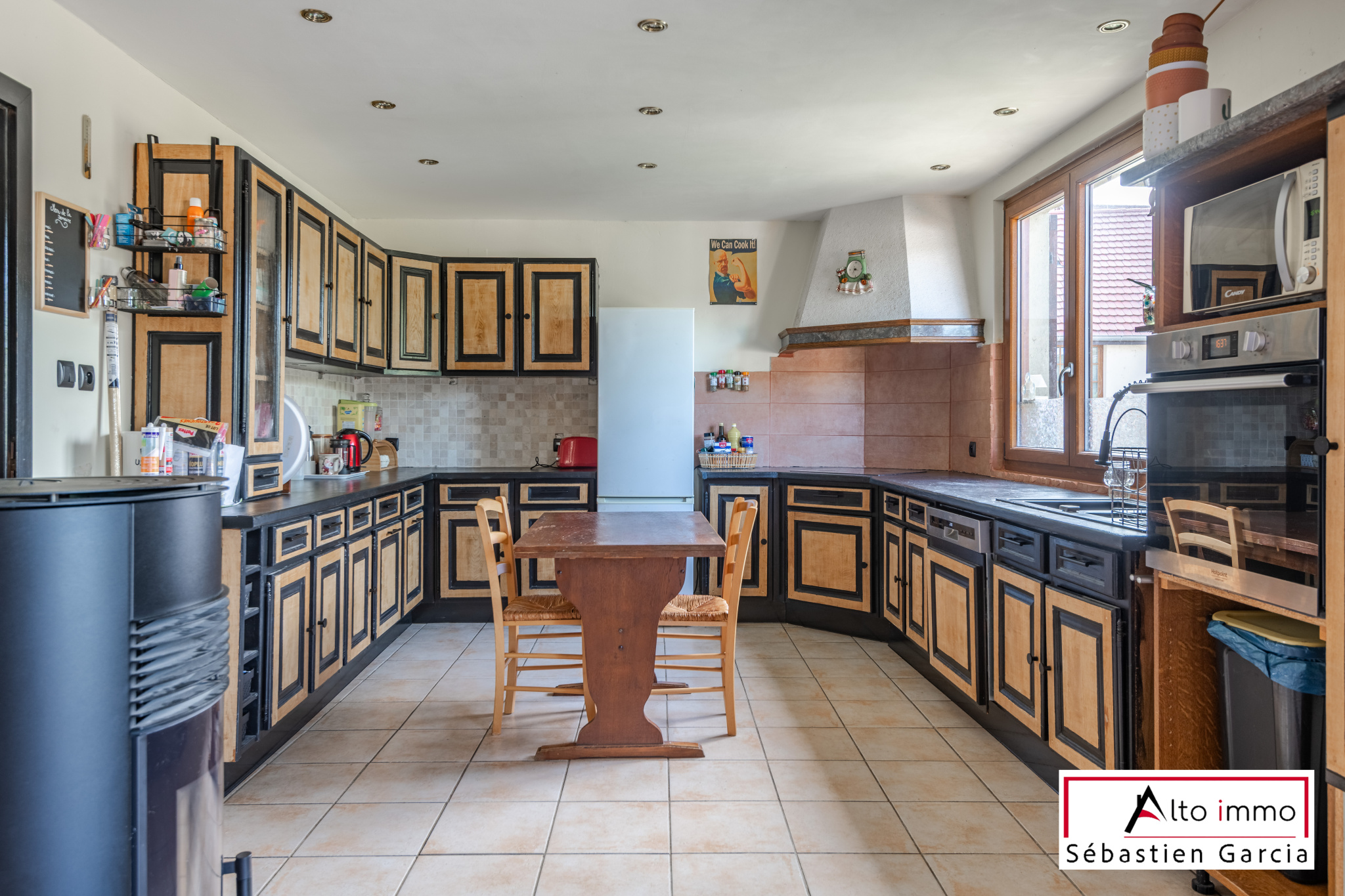 La partie arrière composée d'un sous-sol comprenant l'espace chaufferie, des toilettes et un atelier, au 1er niveau, le salon/salle à manger, une cuisine équipée ouverte, la salle de bain et les toilettes. Sur le second niveau 4 chambres, une salle d'eau avec douche et toilettes, ainsi que des espaces disponibles pour bureau ou coin lecture.