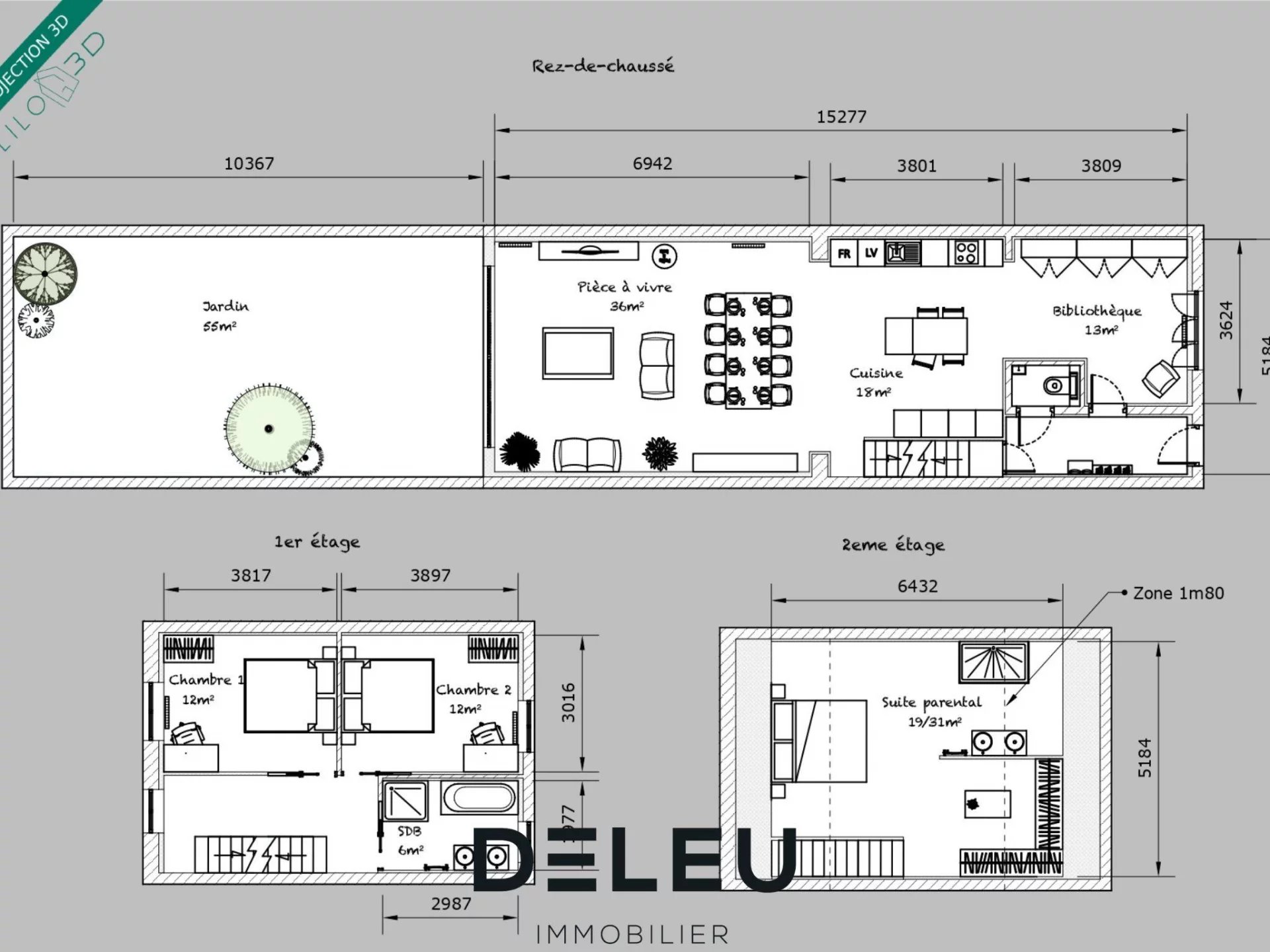 Aux étages, possibilité 3 chambres dont une suite parentale + salle de bain OU 4 chambres + salle de bain.