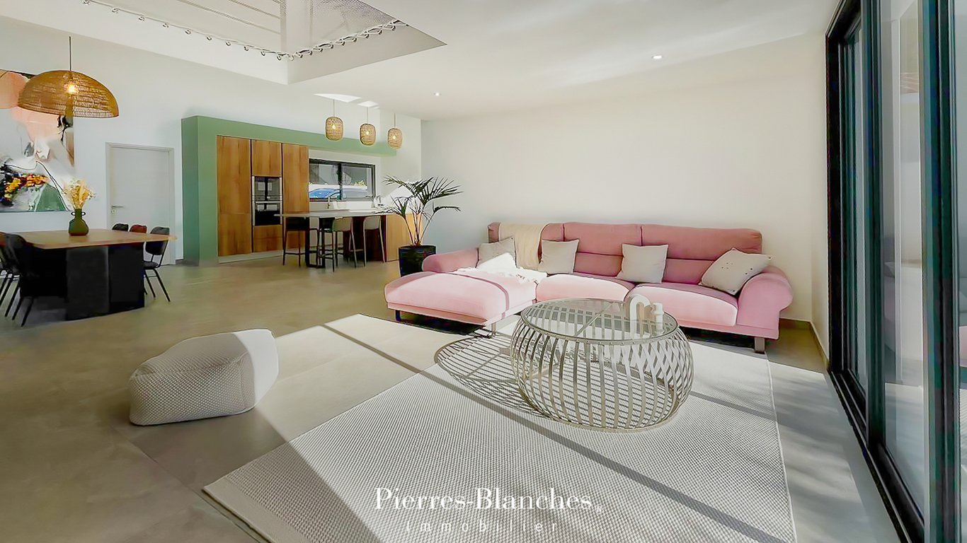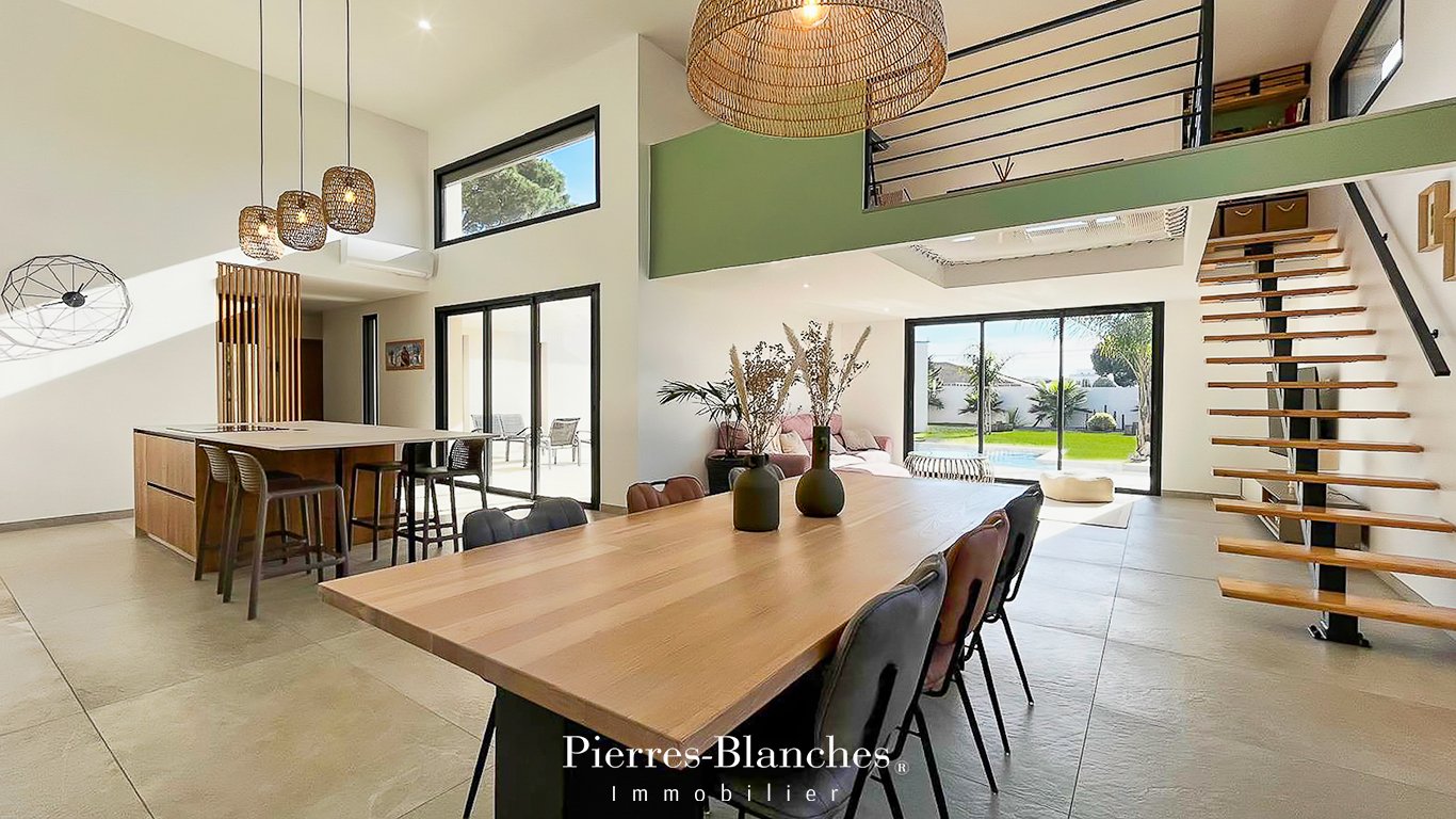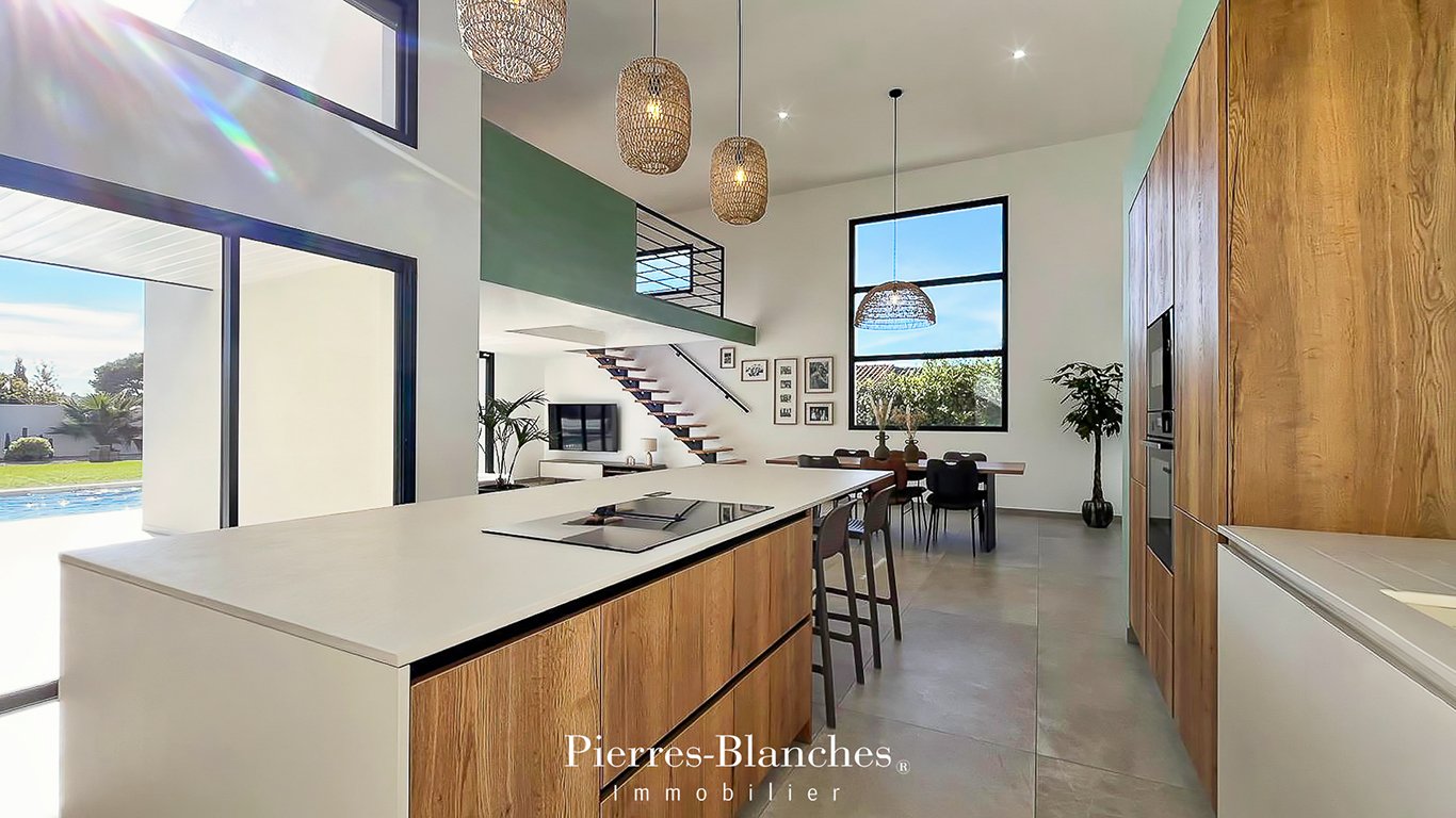 PIERRES-BLANCHES IMMOBILIER - L'EXPRESSION DU LUXE Béziers - PBI Crush Dans l'un des quartiers les plus prisés de Béziers, cette villa bâtie en 2022 incarne la douceur moderne et le confort optimisé. Conçue avec un soin particulier pour répondre aux exigences d'aujourd'hui, elle associe des lignes contemporaines pour s'intégrer parfaitement à son environnement. Avec une superficie généreuse de plus de 163 m², ce lieu de vie édifié sur un terrain de 1049 m² s'élève sur un étage. Ce lieu de vie dégage une énergie urbaine cependant très en lien avec la nature. Cette villa nous offre de vastes espaces de vie agréables où les lignes épurées et les espaces lumineux mettent en valeur chaque détail de sa conception. Dès l'entrée par une large porte en bois, la pièce de vie nous accueille, baignée de lumière grâce aux larges baies vitrées ouvrant sur une terrasse orientée au Sud nous offrant dans son prolongement un accès direct vers les extérieurs soigneusement agencés. Le séjour, augmenté grâce à une hauteur sous plafond significative, s'inonde de lumière naturelle grâce aux baies vitrées panoramiques. L'ensemble allonge son périmètre carré vers la terrasse, nous révélant le jardin paysagé à l'entretien aisé. La cuisine en open space se distingue par sa fusion harmonieuse entre le charme du bois et des éléments contemporains raffinés. Elle allie la chaleur du bois à la sobriété minérale et crée un équilibre visuel incontestable. Parée d'un îlot central, cet espace animera le registre culinaire des retrouvailles familiales et amicales. L'autre aile de l'habitation nous mène vers l'espace de repos comportant trois chambres, dont une suite parentale avec salle d'eau privée et dressing. Chaque chambre spacieuse, est agencée avec soin pour assurer confort et intimité. La force imposée par la structure aérienne et moderne de l'escalier à limon central attire notre curiosité. Nous découvrons un espace bureau lumineux et confortable depuis la mezzanine. Le contraste entre les matériaux contemporains et les éléments naturels confère à l'espace une esthétique unique et intemporelle. À présent, parcourons les extérieurs paysagés qui s'étirent sur sensiblement 600 m². Entre les résineux et les différentes variétés de palmiers, le soleil enflamme la blancheur éclatante de la façade. Agrémenté d'une piscine cernée par une terrasse carrelée, nous profitons de cet environnement composé d'une nature verte, minérale et omniprésente. Le Plus : Un garage aménagé laisse place à la buanderie et à une mezzanine dédiée au rangement, ce qui optimise la fonctionnalité du lieu. Le portail automatisé permet d'allier discrétion et confort, il est le gardien de l'espace privatif pouvant accueillir six véhicules. Un espace de stationnement extérieur pour quatre véhicules supplémentaires. Piscine sécurisée. La cuisine d'été équipée, ombragée et spacieuse, permettra de prolonger la belle saison en proposant un mode de vie méditerranéen. L'emplacement stratégique nous permet de bénéficier d'un accès direct vers le centre historique de Béziers. Notre Avis : Lovely Home ® Dans la conception de cette habitation, les espaces clos dans lesquels chacun pourra trouver son intimité alternent avec les pièces à ciel ouvert afin de bénéficier d'une vie inside and out où le soleil méditerranéen a définitivement pris sa place de protagoniste. "Une Vision Authentique et Contemporaine de l'Immobilier de Luxe." Franck Ballester ® TOUTE INSPIRATION, MODIFICATION, REPRODUCTION EST INTERDIT - REGISTERED TRADEMARK Dossier sur références Contact +33 (0)4 67 70 07 87
