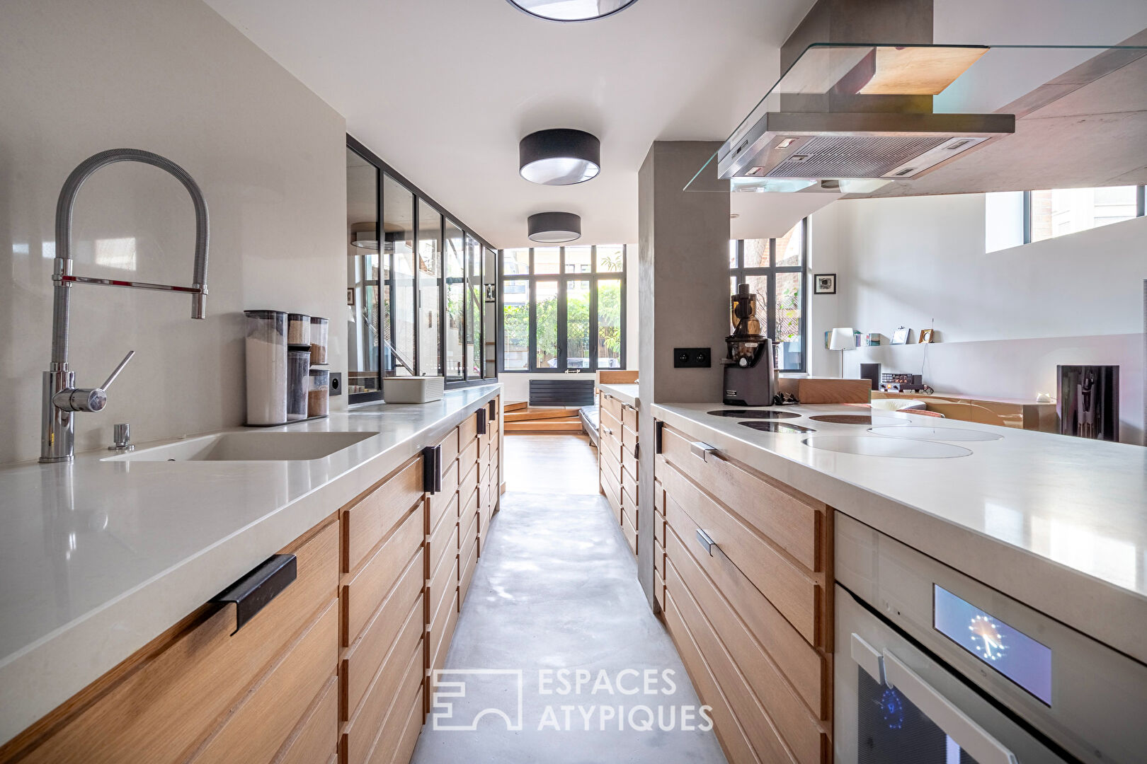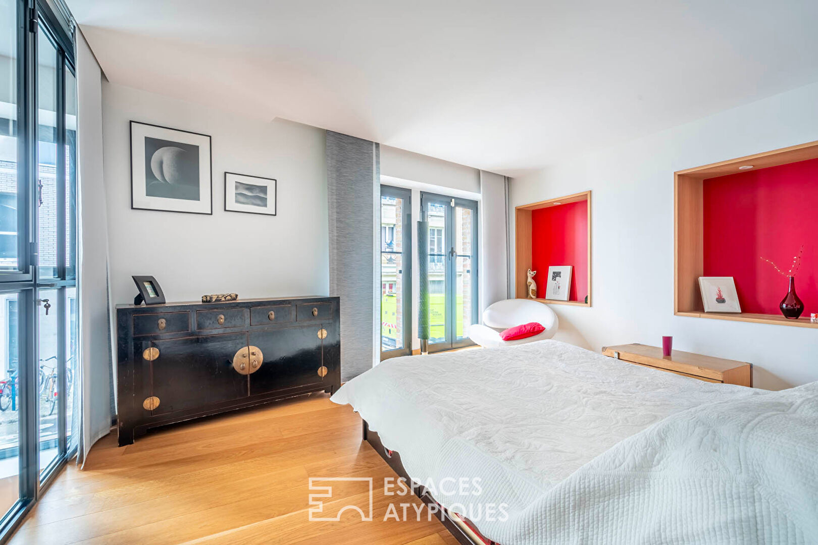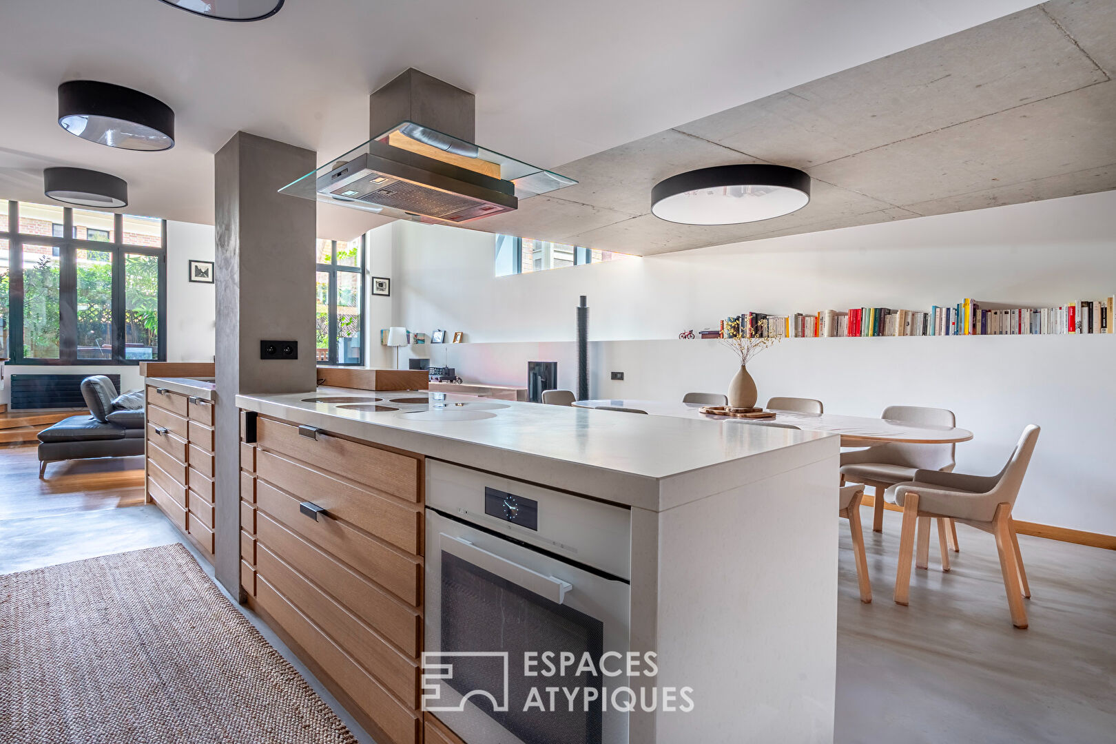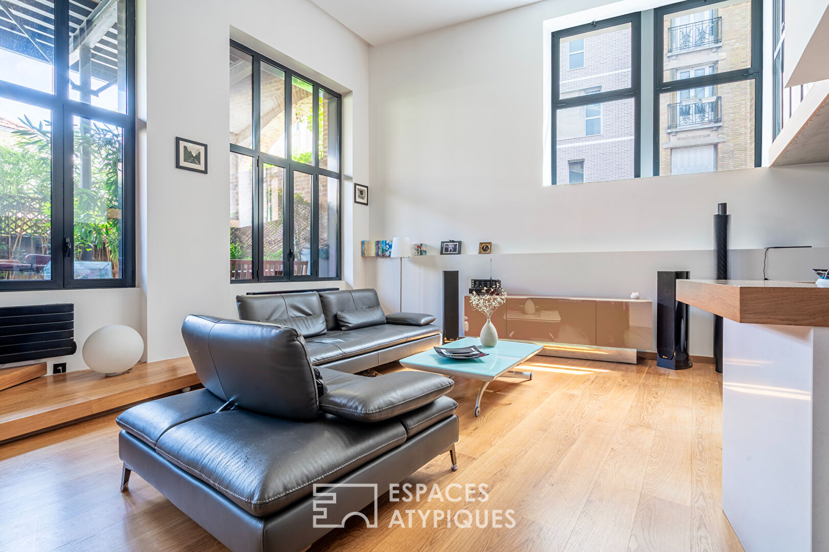 Idéalement situé dans le quartier de l'Eglise de Pantin, au calme d'une rue à sens unique, à proximité des commerces et du canal de l'Ourcq, ce duplex traversant de 109,74m2 (105,33 m² Carrez) profite d'une terrasse de 27 m². Issu de la transformation d'une ancienne laiterie, ce bien rare a été entièrement repensé par un architecte, sublimant les volumes et la lumière grâce à de larges verrières toutes hauteurs. Les parties communes végétalisées ajoutent une touche de sérénité et d'intimité à ce lieu unique. En rez-de-chaussée, un double séjour cathédral, sous 4,70 mètres, ouvre sur une cuisine équipée. L'ensemble totalisant 55 m² est prolongé d'une terrasse. Un bureau avec verrière, astucieusement aménagé pour accueillir un couchage ainsi qu'un water-closet complètent ce niveau. Le long du séjour, un bel escalier en bois, agrémenté d'une bibliothèque sur mesure, mène au premier étage. La suite parentale totalisant 30 m² se déploie en véritable cocon. Elle se compose d'une salle de bains avec douche et baignoire, d'un dressing aménagé et d'un water-closet indépendant. Le caractère industriel, les lignes épurées ainsi que le confort contemporain confèrent à ce bien d'expression, idéalement situé, une atmosphère à la fois chaleureuse et sophistiquée. Possibilité d'un parking couvert en sus, ce bien soumis au statut de la copropriété. Métro : Eglise de Pantin à 250 mètres CLASSE ENERGIE : D/ CLASSE CLIMAT : B Montant moyen estimé des dépenses annuelles d'énergie pour un usage standard, indexées aux années 2021, 2022, 2023 : entre 1 490 euros et 2 070 euros (abonnement compris) Les informations sur les risques auxquels ce bien est exposé sont disponibles sur le site Géorisques : https://www.georisques.gouv.fr Contact: Grégory 06 60 65 34 66 RSAC : 822 473 120 Paris Copropriété de 36 lots - dont 19 lots habitation. (Pas de procédure en cours). Charges annuelles : 3084 euros. Gregory Brasier (EI) Agent Commercial - Numéro RSAC : 822 473 120 - Paris.