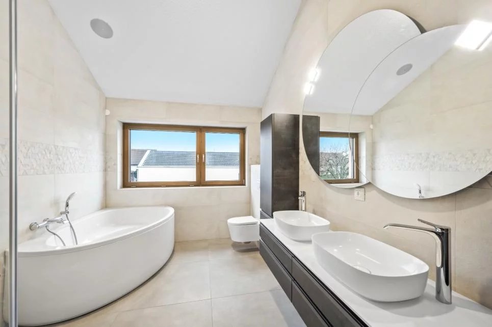 - Salle de bain principale : 9,9 m² (baignoire d’angle, douche à l'italienne, meubles lavabo, WC)