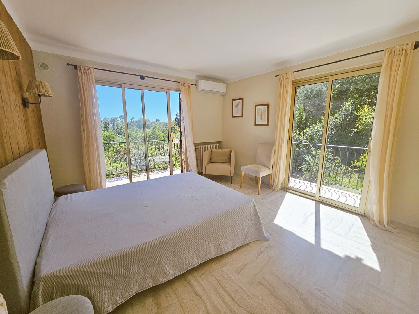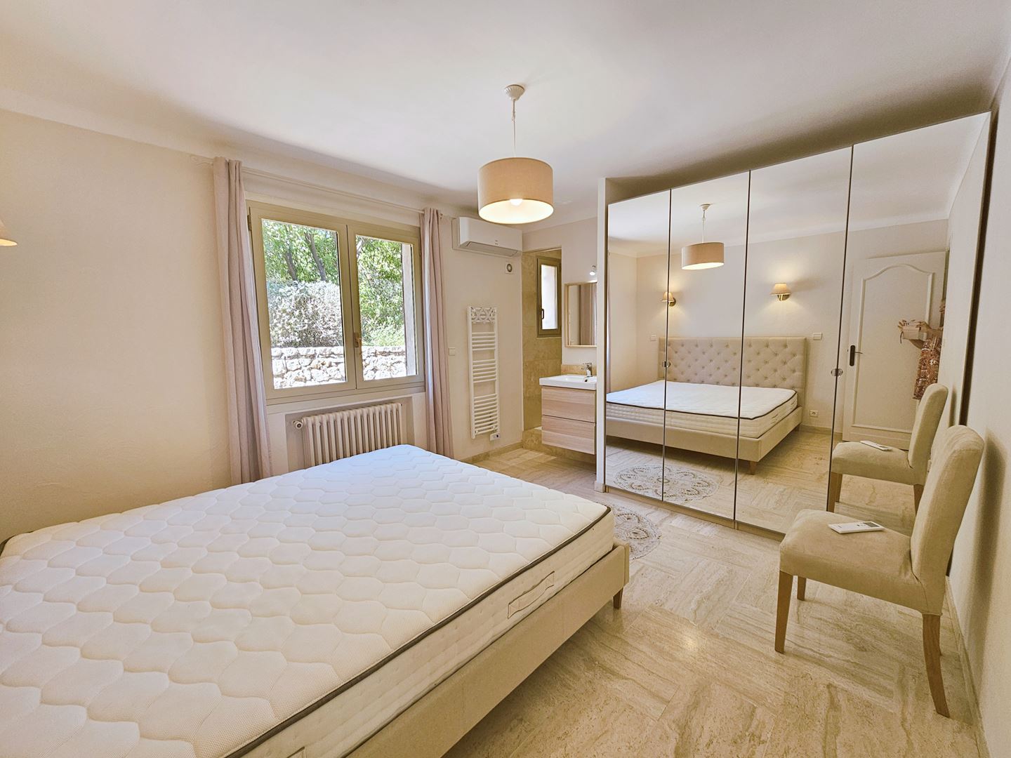 Mougins dans le quartier résidentiel de la Grande Bastide, Magnifique appartement 4p meublé de 124 m2 au 1er étage d'une villa, entièrement rénové et meublé à neuf, il se compose d'une vaste entrée au rdc avec de grand placards, A l'étage un double séjour de 35m2 avec cheminée insert donnant sur une agréable terrasse et un balcon, une cuisine américaine entièrement équipée, un wc invité , 3 chambres avec placards très spacieuses ( 13, 14 et 15 m2) dont une avec douche et lavabo , une salle d'eau avec armoire lingerie comprenant lave linge et sèche linge . Très belle vue dégagée et calme. 2 parkings extérieurs privatifs, climatisation réversible, double vitrage. accès direct du jardin à la piscine (4x 8). Location meublée longue durée 2350 euros cc ( provision eau froide 50 euros incluse avec régularisation annuelle). caution 2 mois de loyer hors charges . honoraires 1614 euros euros ttc libre le 15 septembre. location d'un an minimum