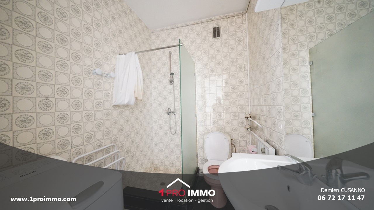 - une entrée, un salon de 20 m² disposant d'un espace nuit aménagé avec placards, une cuisine équipée de 4.04 m² et une salle d'eau avec un WC.