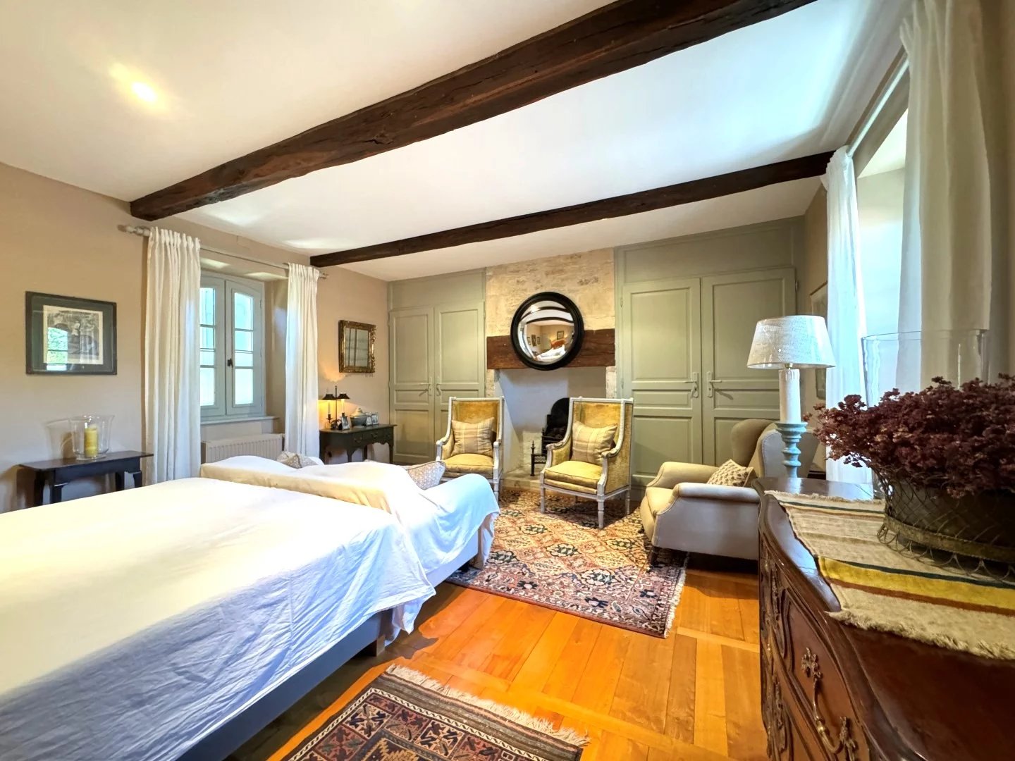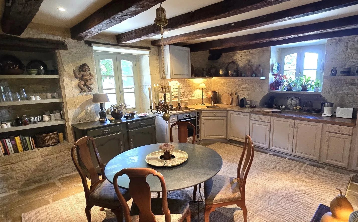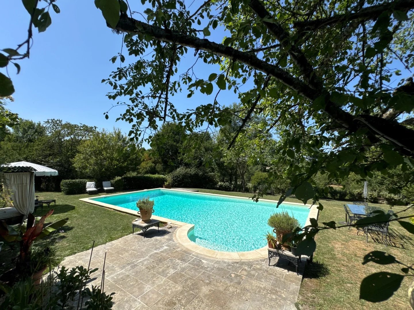 Cette belle demeure ancienne séduit d'emblée par ses volumes généreux et le cachet de ses éléments d'origine : escalier en pierre, dallage ancien, cheminées... La maison s'organise autour d'une vaste entrée desservant une cuisine authentique avec évier et plans de travail en pierre, ainsi qu'un salon et chambre ouverte sur un patio, buanderie/chaufferie. À l'étage, se trouvent un second salon lumineux avec cheminée, 2 chambres spacieuses, dont une avec salle d'eau attenante installée dans le pigeonnier et une salle de bains familiale. Un jardin arboré de plus de 5800 m², accueille une élégante tour, une piscine avec cuisine d'été et sanitaires ainsi que de nombreux espaces ombragés. La propriété dispose également d'un chauffage central au fioul, d'un poêle à bois, d'un abri voiture et d'un raccordement au tout-à-l'égout. Un lieu de charme, idéal pour les amoureux d'authenticité et de nature.