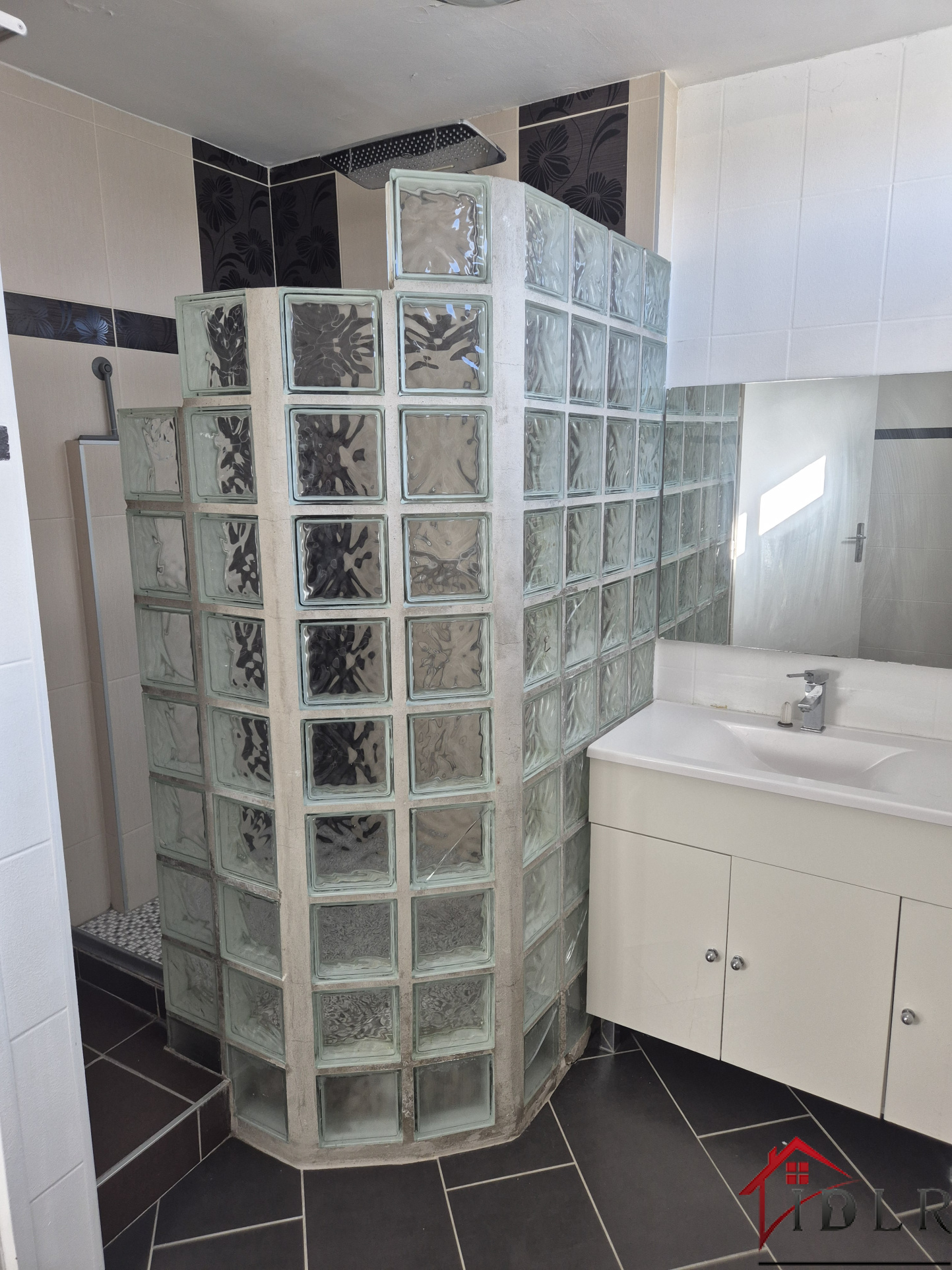Entrée avec placards desservant un espace de vie très lumineux avec une cuisine équipée, deux chambres, une salle d'eau avec douche + meuble vasque et des toilettes séparés.