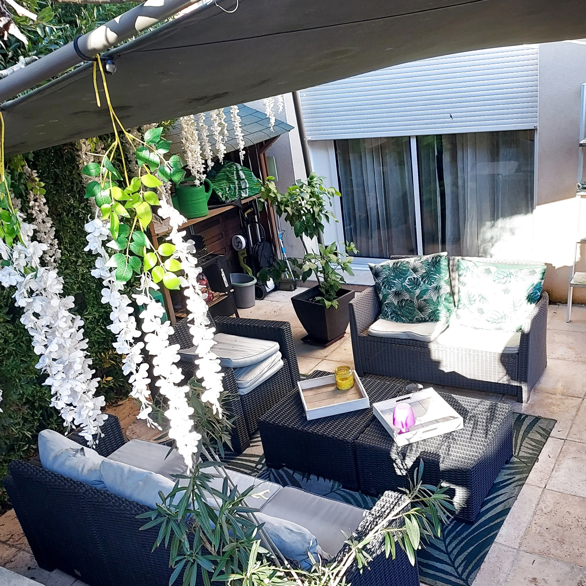 2 terrasses (devant et derrière), garage, pas de jardin. Fenêtres, baie vitrée en double vitrage avec volet alu radio commandé, plancher chauffant electrique, ballon d'eau chaude thermodynamique, poêle à granulés, panneau solaire
