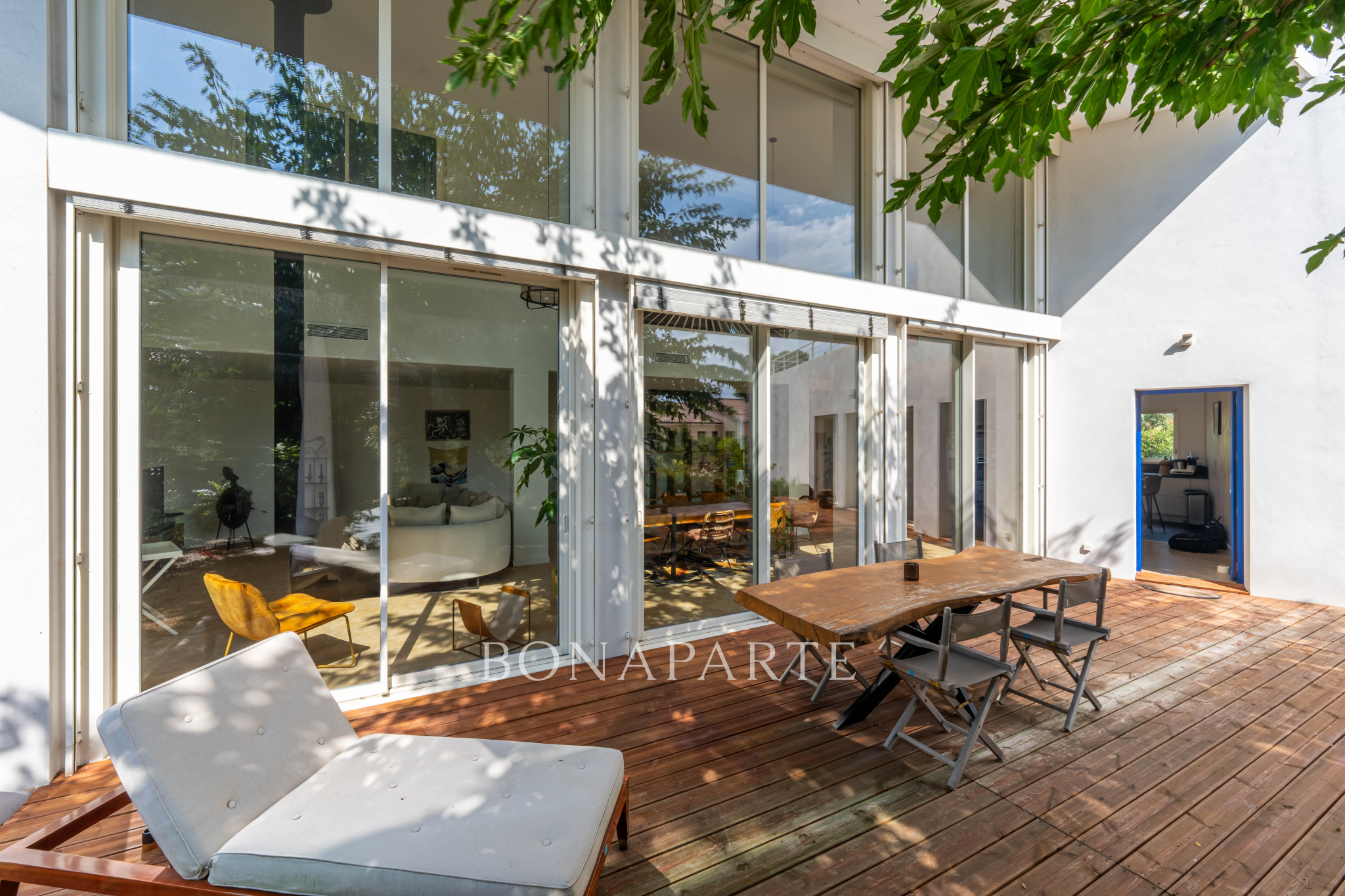 Dès l'entrée, la lumière s'impose comme fil conducteur. Le séjour cathédrale aux volumes spectaculaires s'ouvre sur le jardin paysager, créant une continuité naturelle entre intérieur et extérieur. La cheminée design Focus souligne le caractère unique de cet espace de vie, tandis que la cuisine haut de gamme et son cellier attenant conjuguent esthétisme et fonctionnalité.