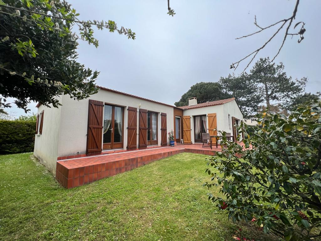 COTE IMMOBILIER AGENCE DE LA BAIE - COUP DE COEUR pour cette maison de plain-pied dans un écrin de verdure dans quartier recherché , à 200 m de la plage et à proximité des commerces, maison non mitoyenne comprenant : un séjour/salon avec cheminée foyer ouvert, une cuisine aménagée et équipée, deux dégagements avec placards, quatre chambres, une salle d'eau, une salle de bains avec baignoire d'angle, deux wc Un garage attenant Beau terrain clos et arboré d'environ 666 m² avec terrasse COTE IMMOBILIER AGENCE DE LA BAIE 27 rue Clémenceau 44760 LA BERNERIE EN RETZ 02 51 74 67 95 www.cote-immobilier.com (4.48 % honoraires TTC à la charge de l'acquéreur.)