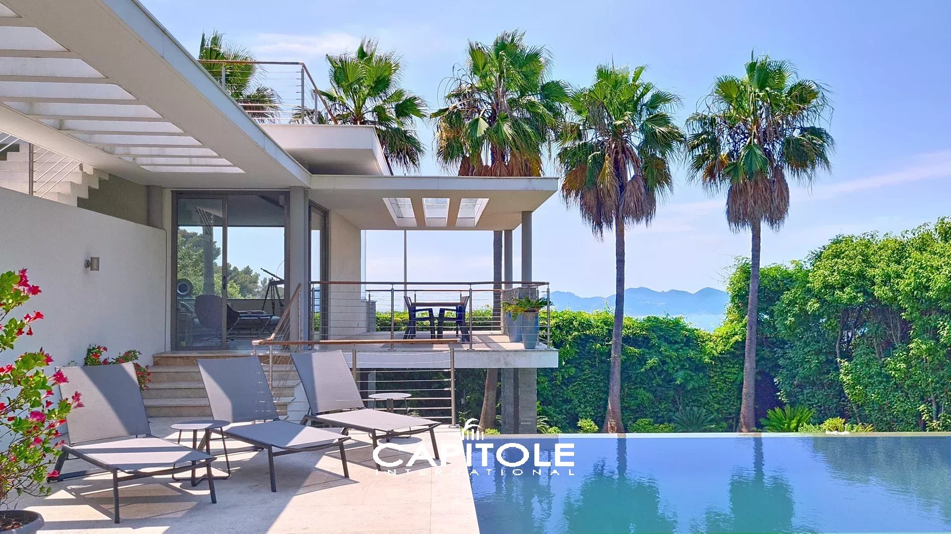 Cette propriété baigne dans une ambiance luxuriante au milieu des jardins méditerranéens de plus de 1000 m², sa piscine à débordement et la mer scintillante.