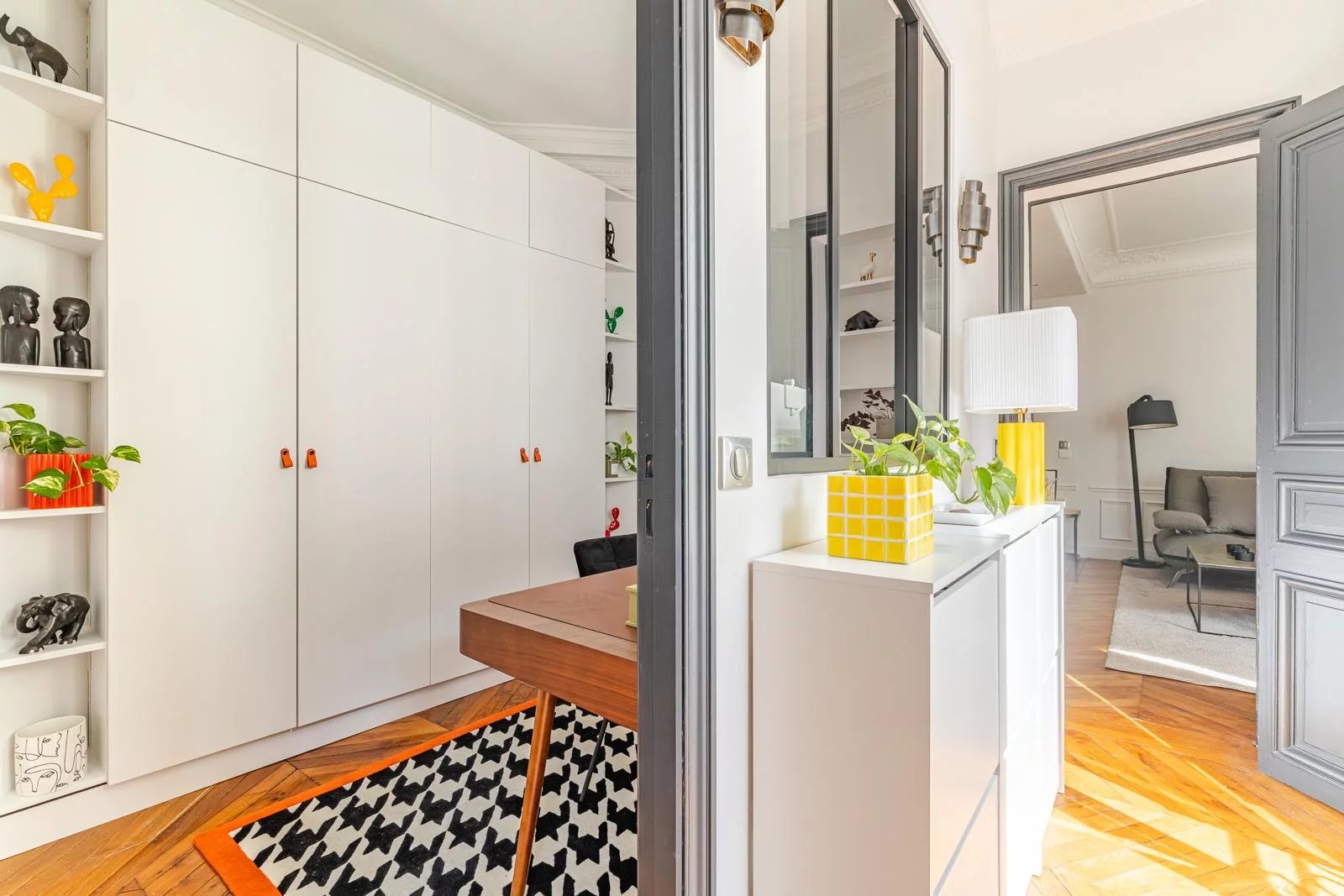 PARIS 16 -Passy-Dans un très bel immeuble pierre de taille, au 4ème étage, bel appartement composé d'une entrée desservant un grand salon avec cuisine américaine entièrement équipée, une chambre spacieuse, une salle de douche, un WC séparé.L'appartement est en parfait état.Il dispose du charme de l'ancien : parquet; moulures; bel hauteur sous plafond.