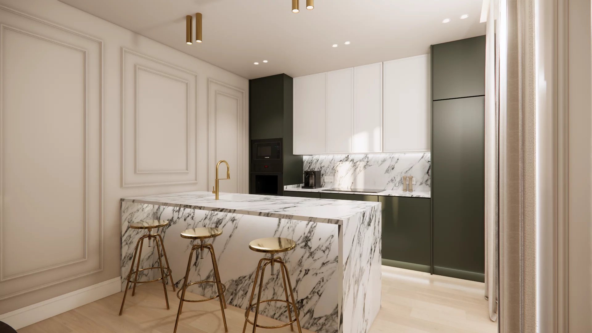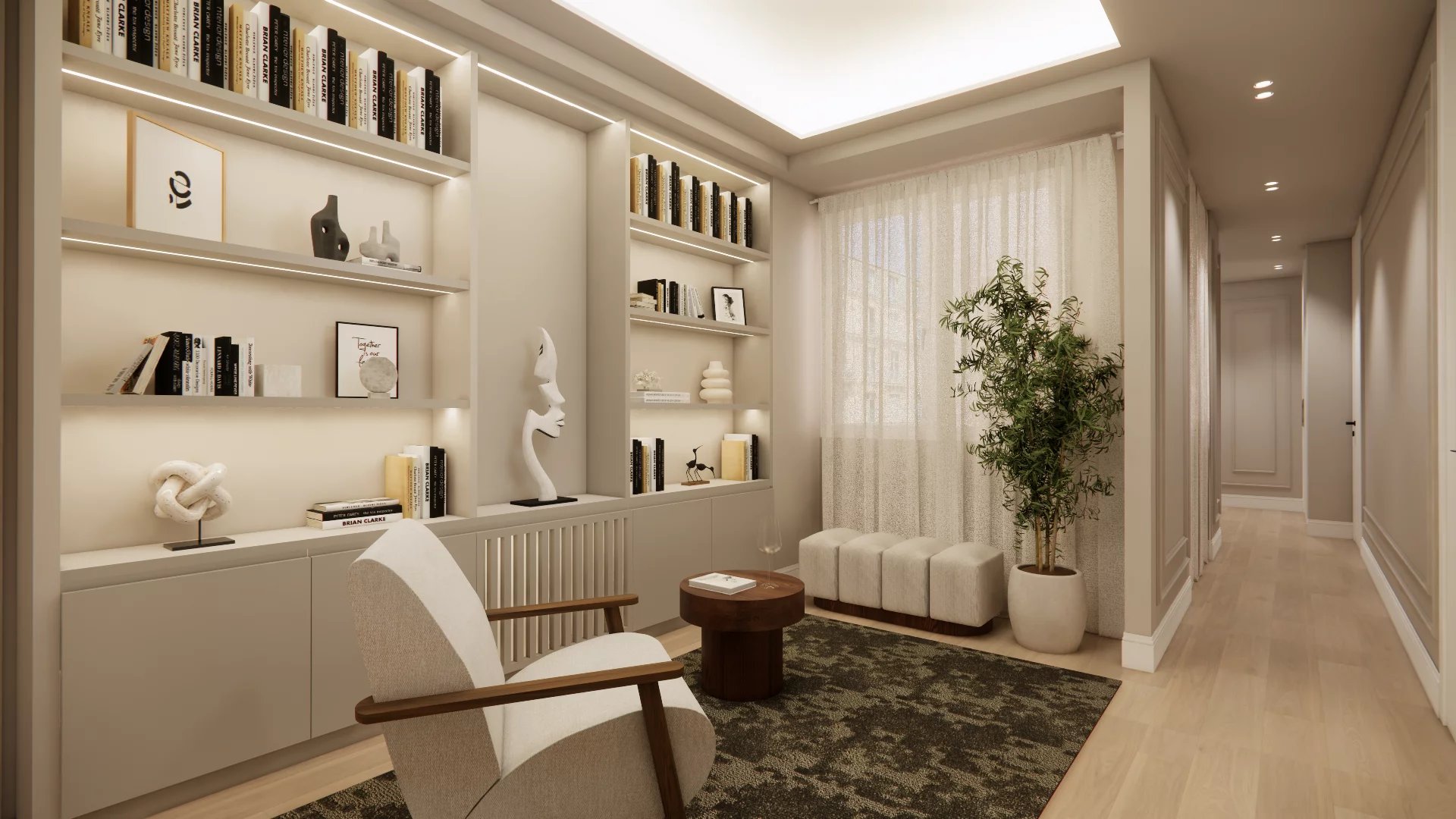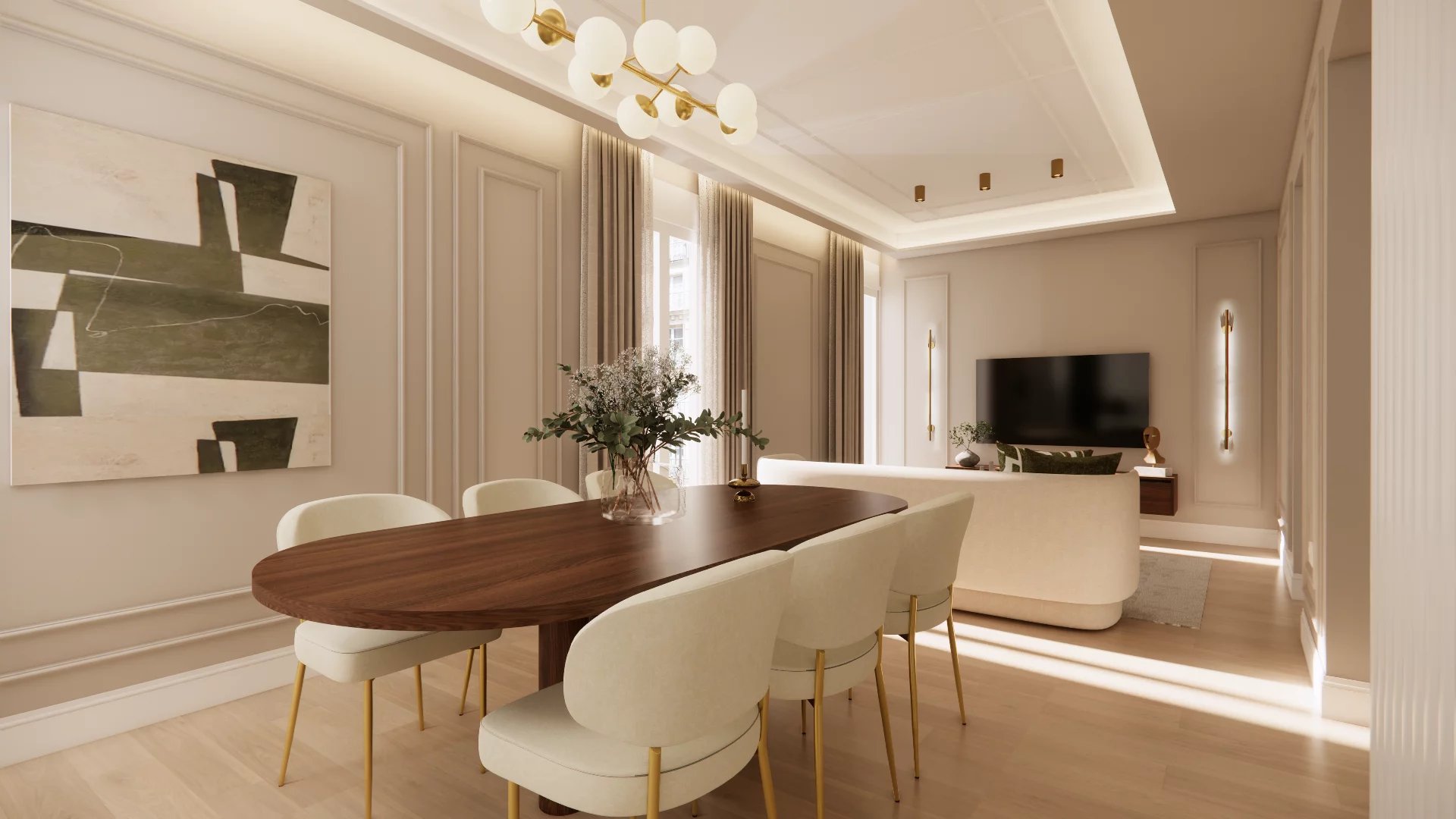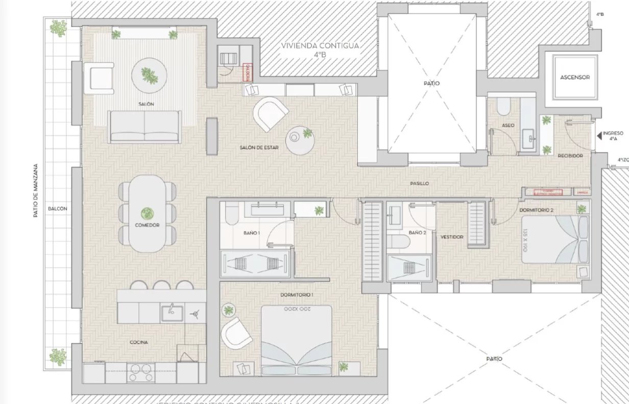 Located on the fourth floor of a classic 1940 building, this modernized interior apartment offers 117 m² of built space. The home includes two bedrooms and three bathrooms, and incorporates smart home technology, central heating, and air conditioning for contemporary comfort.