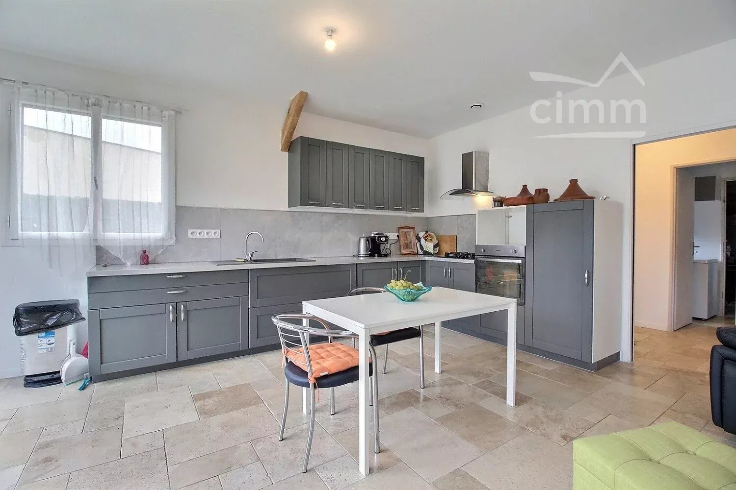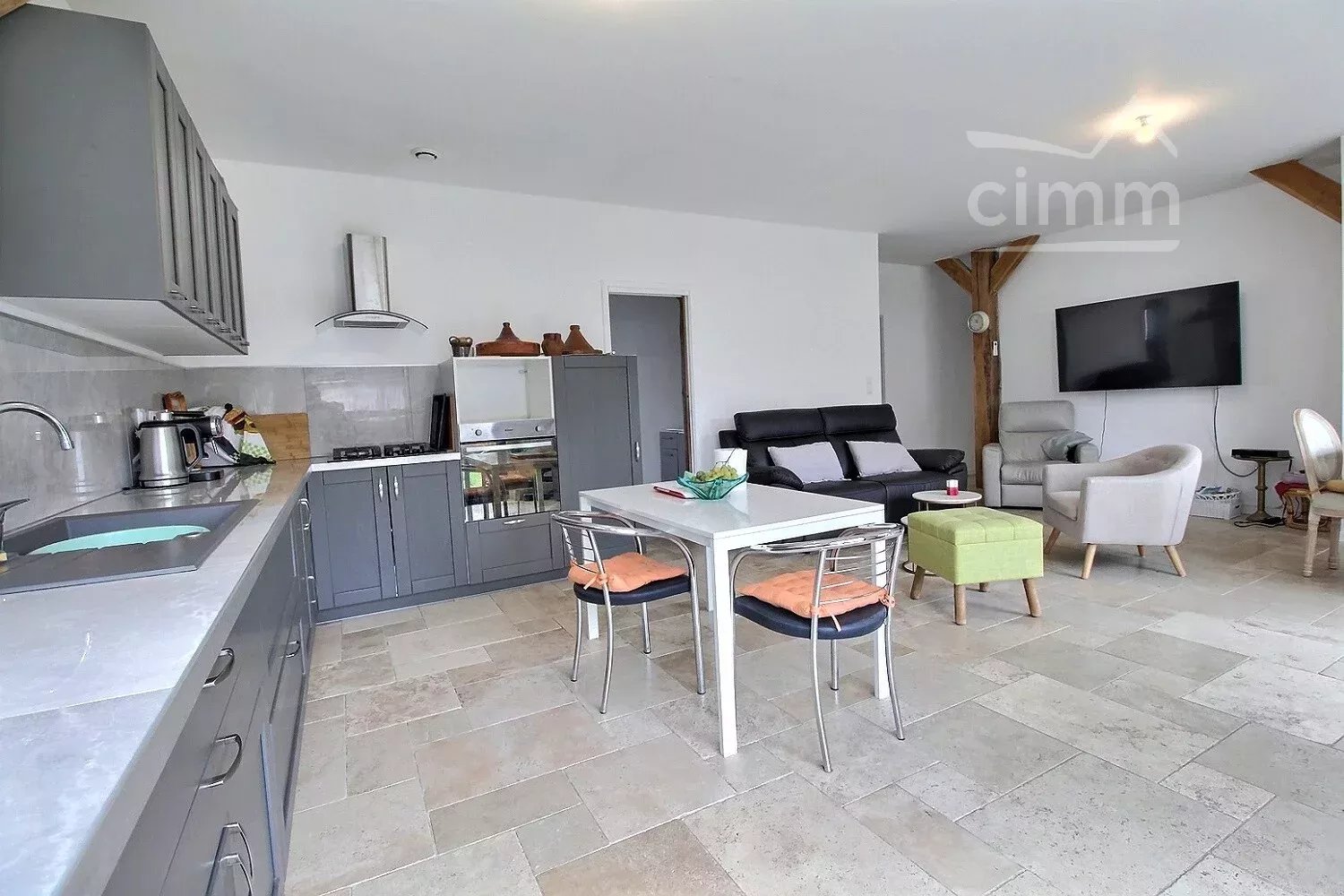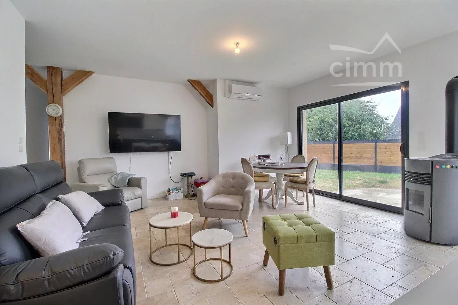 L'entrée s'ouvre sur un vaste salon séjour lumineux, doté de la climatisation réversible et d'un poêle à granulés, et ouvert sur une cuisine équipée fonctionnelle moderne.