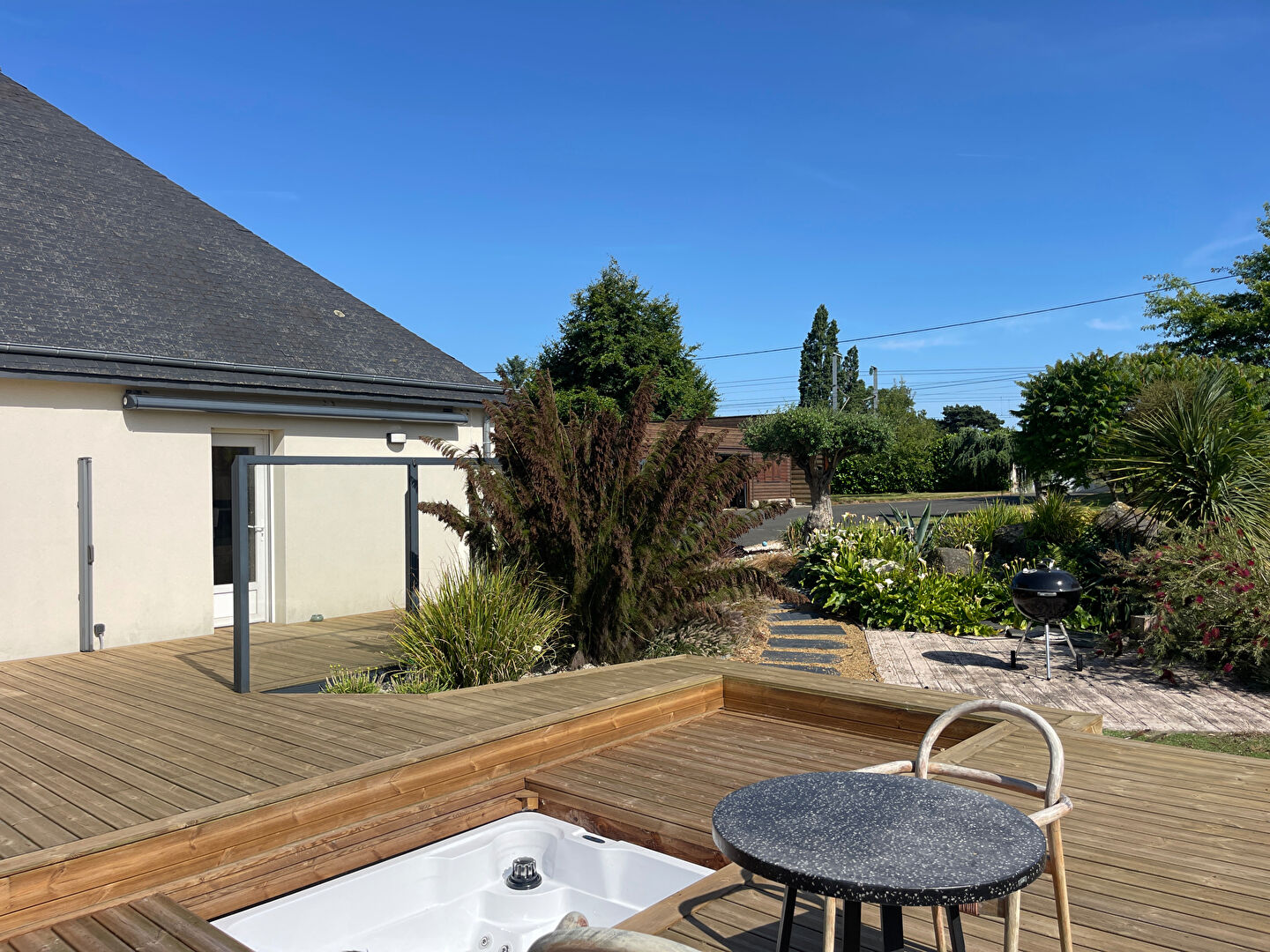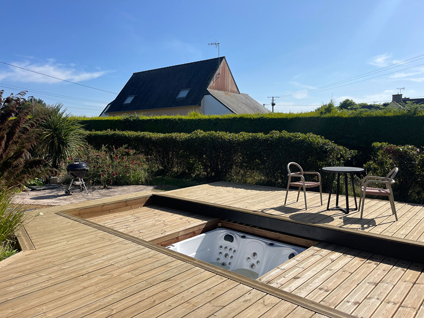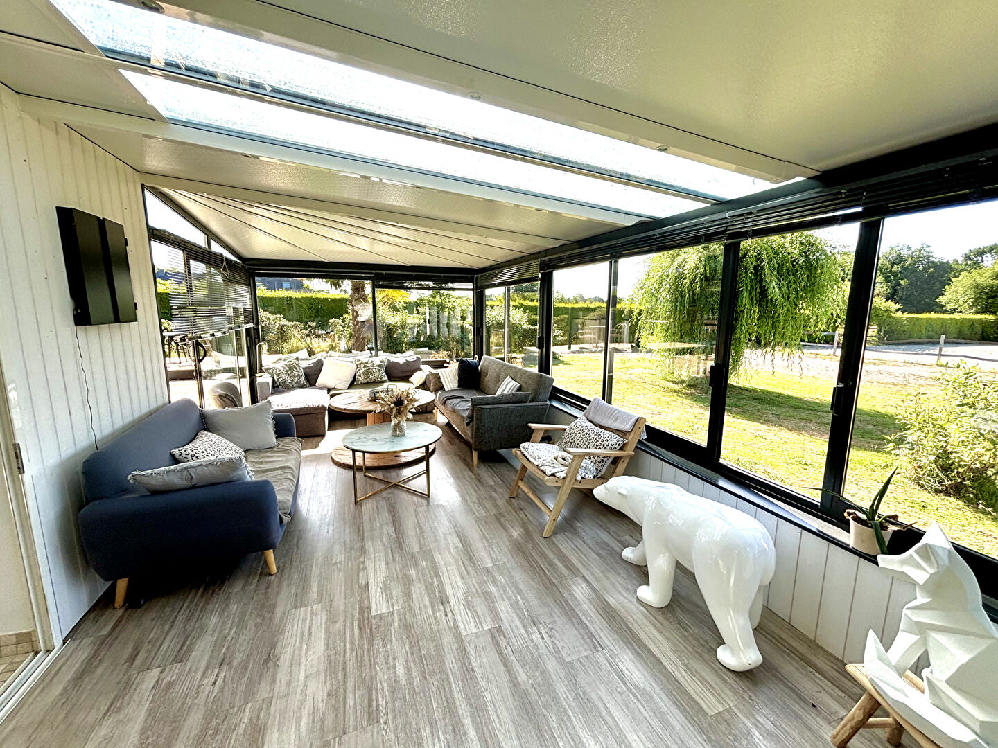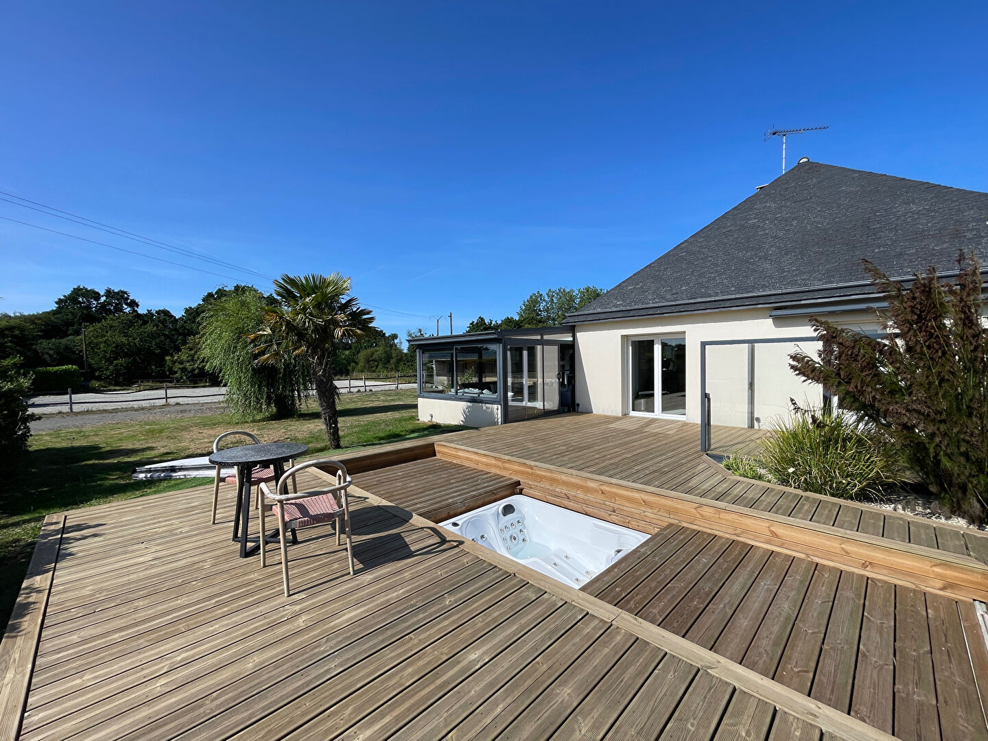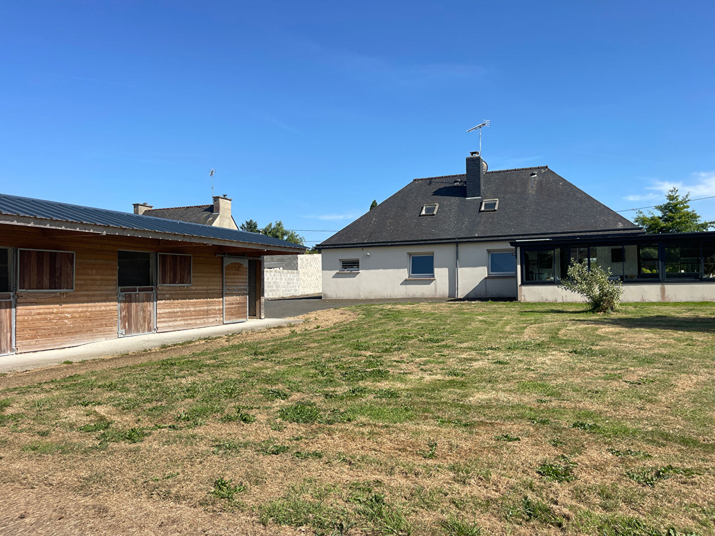 A VENDRE, PLOUFRAGAN, Belle maison contemporaine de 143 m² sur un terrain d'un hectare Cette propriété allie confort moderne et cadre naturel exceptionnel. La maison se compose au rez-de-chaussée d'une entrée avec placard, d'un salon/séjour lumineux avec cheminée et cave à vin, ouvert sur une véranda équipée d'un poêle à pellets, d'une cuisine aménagée et équipée, d'un couloir desservant un WC, une salle d'eau, une chambre, un dressing et un garage. A l'étage : un palier dessert deux chambres, une salle d'eau, un WC et un débarras. A l'extérieur, profitez d'une grande terrasse exposée sud-ouest avec jacuzzi, de trois carports, d'un second garage, d'une carrière drainée de 1200 m², de trois box avec électricité, d'une sellerie/salle de soins, d'une douche extérieure pour chevaux, de cinq paddocks (dont un actuellement utilisé) et d'un étang. Un bien rare, idéal pour les amoureux de la nature et les passionnés d'équitation (4.70 % honoraires TTC à la charge de l'acquéreur.)