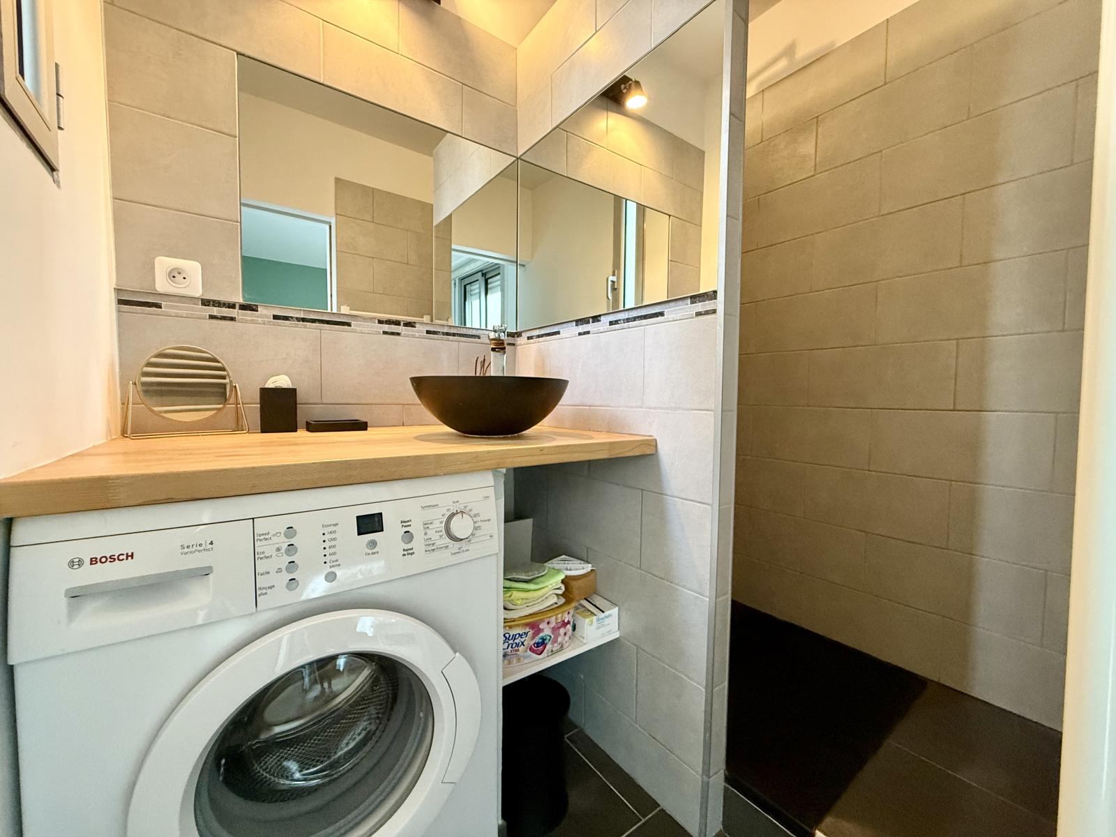 La salle d'eau dispose d'un emplacement pour la machine à laver, l'ensemble du mobilier est cédé avec l'appartement si besoin, la cuisine est en parfait état et de bon goût, la loggia a été intégrée pour plus d'espace et de luminosité
