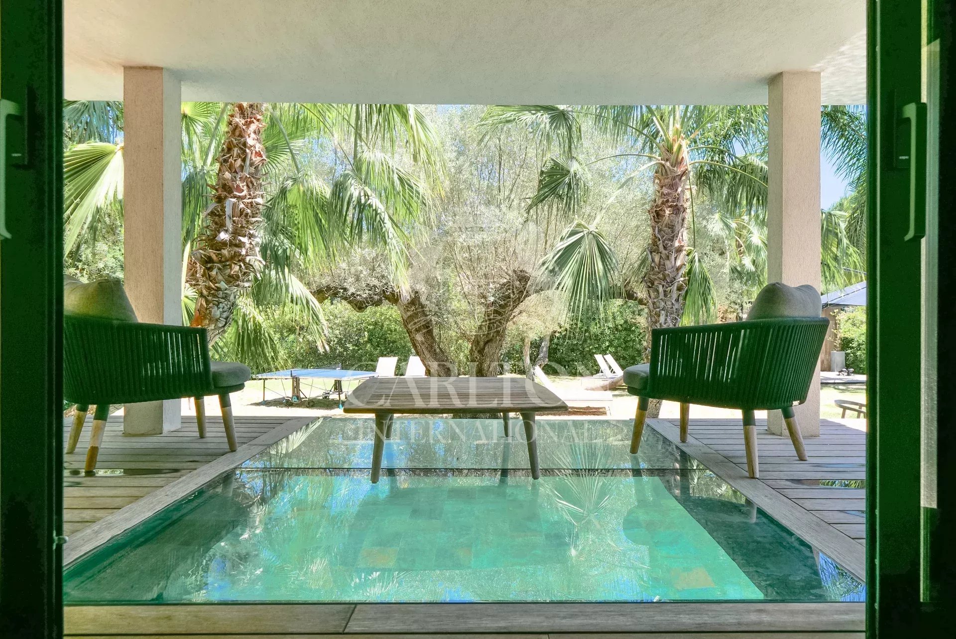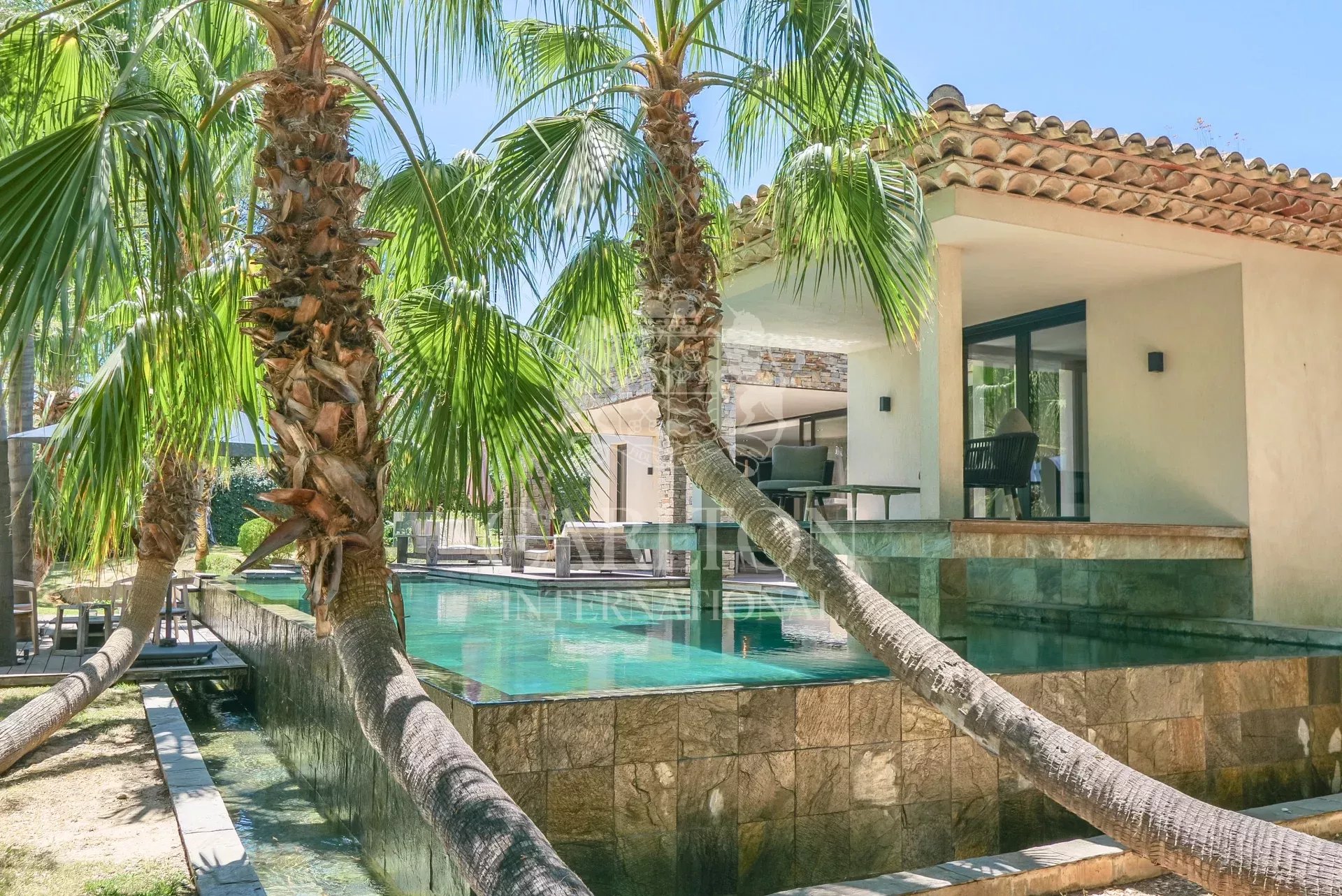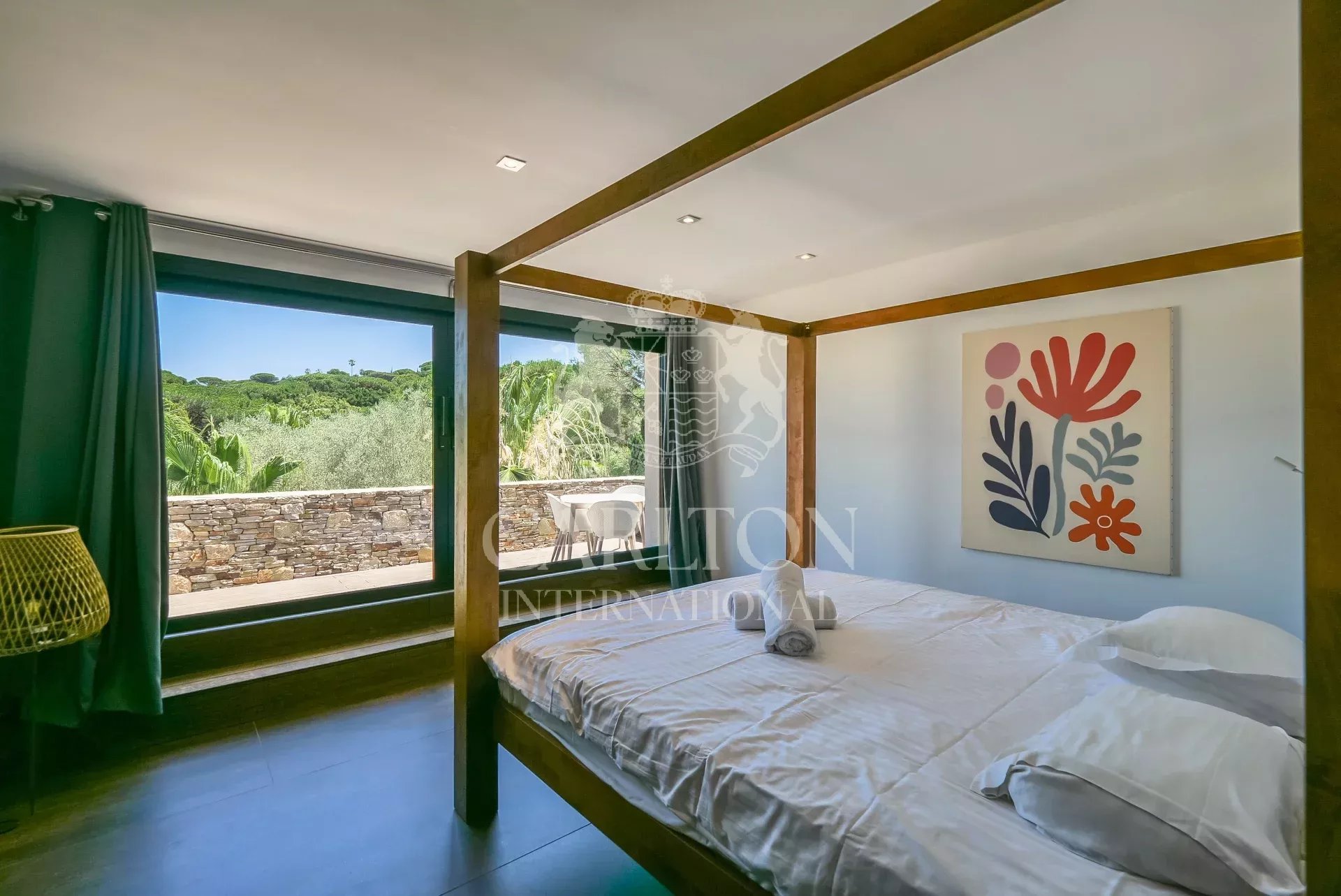 Situata in una delle zone più ricercate di Saint-Tropez, questa villa contemporanea di circa 325 m² offre un ambiente di vita elegante, tranquillo e davvero esotico. Costruita nel 2018 su un terreno paesaggistico di 2.270 m², combina comfort moderno, linee pulite e ispirazione esotica. Fin dall'ingresso, sarete accolti da una cucina a pianta aperta e da un vasto soggiorno passante, che si apre su un patio con piscina da un lato e su una generosa terrazza in teak dall'altro, che conduce a una sontuosa piscina in stile balinese che è un vero e proprio invito al viaggio. La suite padronale, con accesso diretto alla piscina, promette privacy e comfort assoluto. Altre quattro camere da letto si trovano al piano terra, mentre il primo piano ospita tre camere da letto con bagno privato, ognuna con la sua terrazza privata. Il garage parzialmente vetrato permette di vedere la propria auto dal patio, elegantemente integrato nell'architettura contemporanea. Il giardino con palme, i materiali naturali e gli ambienti luminosi conferiscono a questa proprietà uno stile di vita chic ed esotico, a pochi minuti dal centro di Saint-Tropez. Rif. 11825