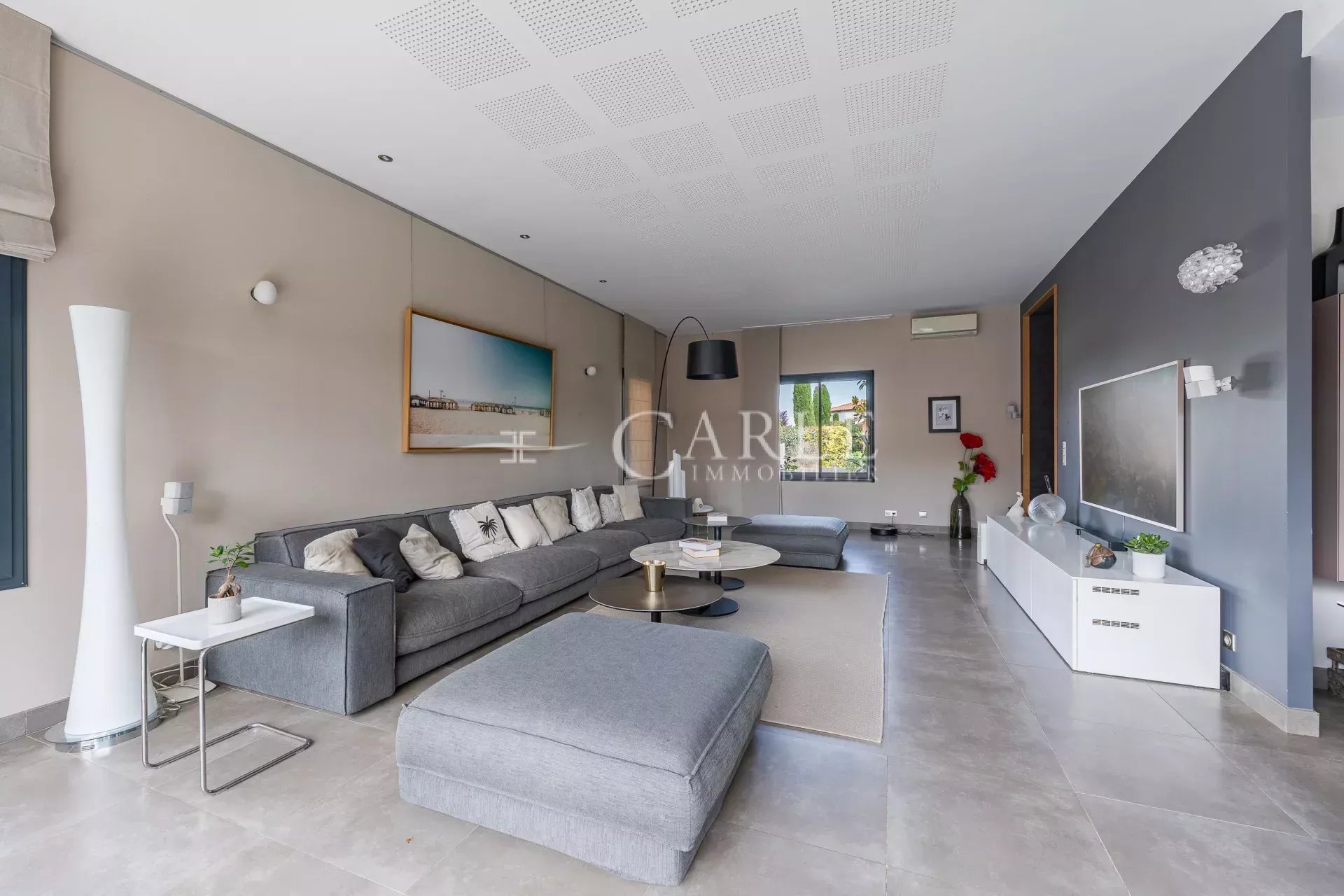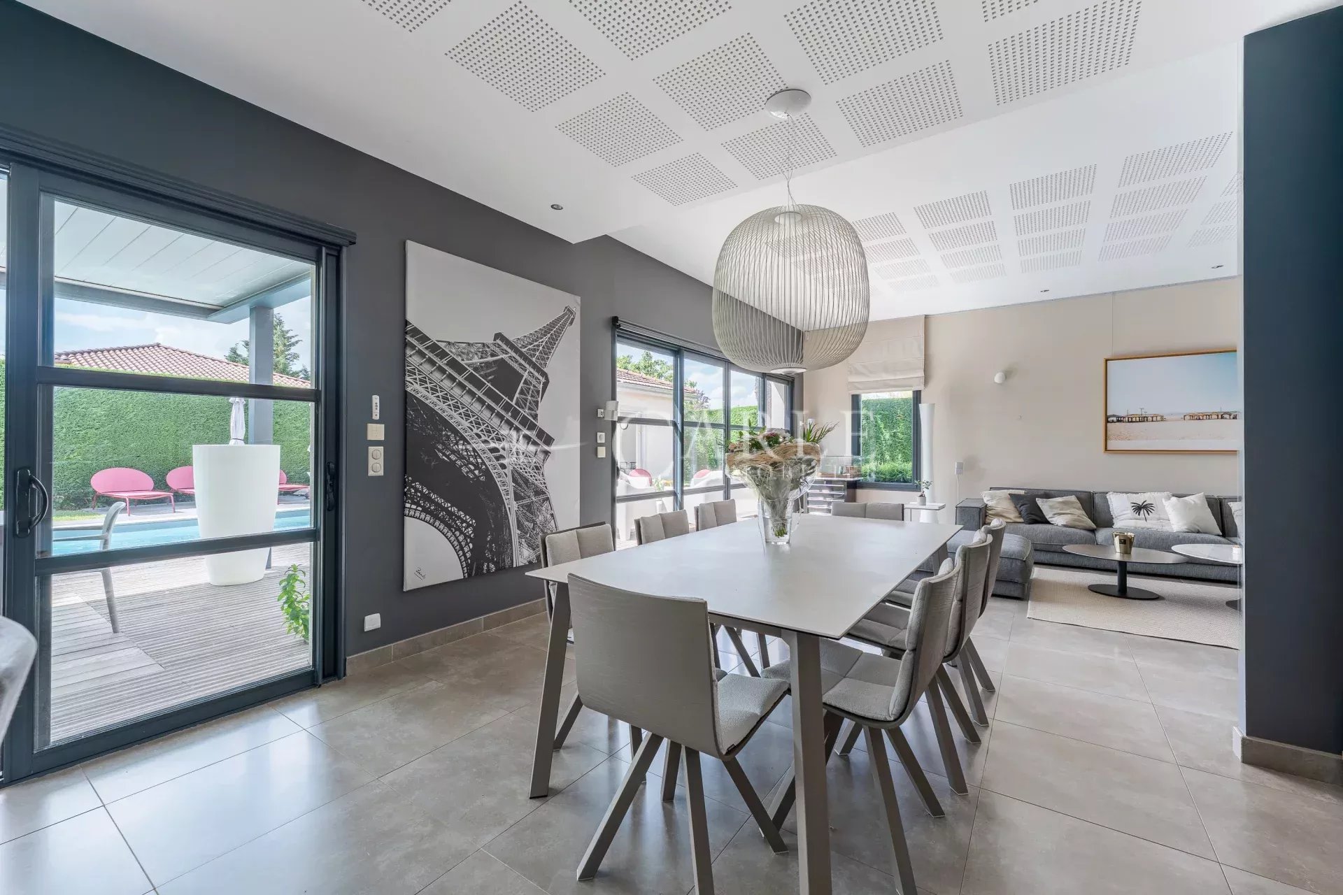 Édifiée sur un terrain paysager de 1 008 m², elle offre un art de vivre rare, sublimé par une piscine au magnesium, chauffée, de 13 mètres par 4 mètres, une terrasse bioclimatique et un jardin arboré soigneusement aménagé.