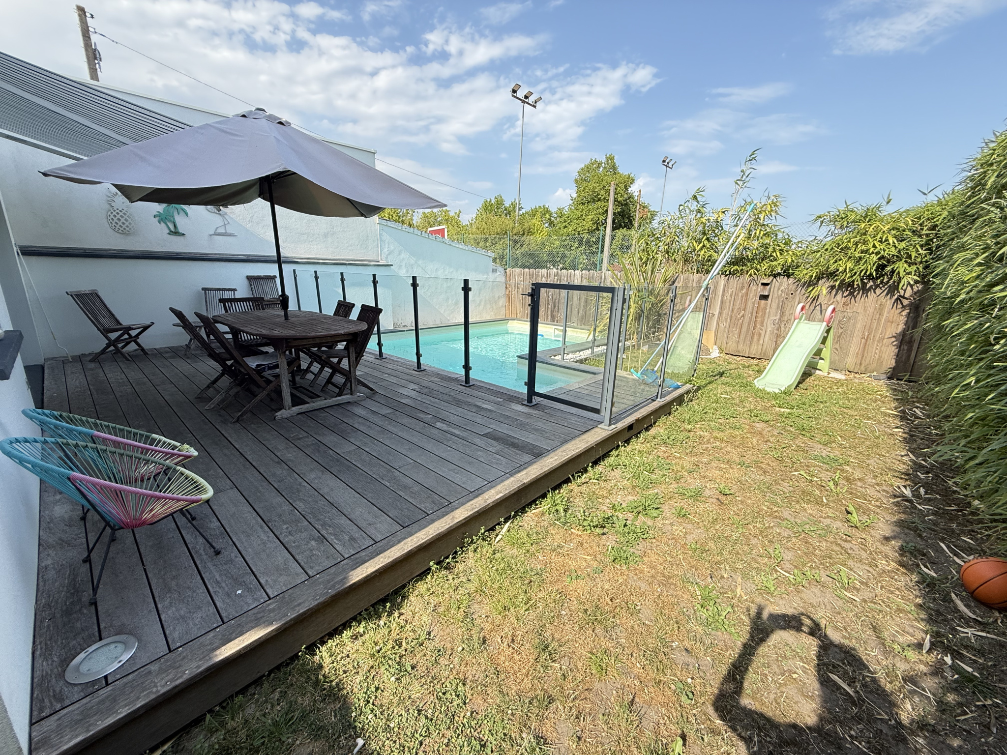 LE BOUSCAT SAINTE GERMAINE - Un emplacement de 1er choix pour cette maison T4 située à deux pas du tramway, des commerces, accès rocade, écoles....Elle se répartit comme suit: une entrée, un séjour traversant de 42m2 avec cuisine entièrement aménagée et équipée, un grand cellier et un WC. L'étage dessert 3 chambres dont une avec terrasse, une salle de bains et un WC indépendant. Vous profiterez d'un charmant jardin avec piscine sécurisée, d'un grand cabanon pouvant être facilement aménagé en cuisine d'été, d'un garage et d'un stationnement supplémentaire. Une maison coup de coeur, parfaitement située, et qui n'attend que vous ! Pour tout renseignement, contactez votre agence indépendante Fanny Dupain Immobilier au 06.87.42.68.97
