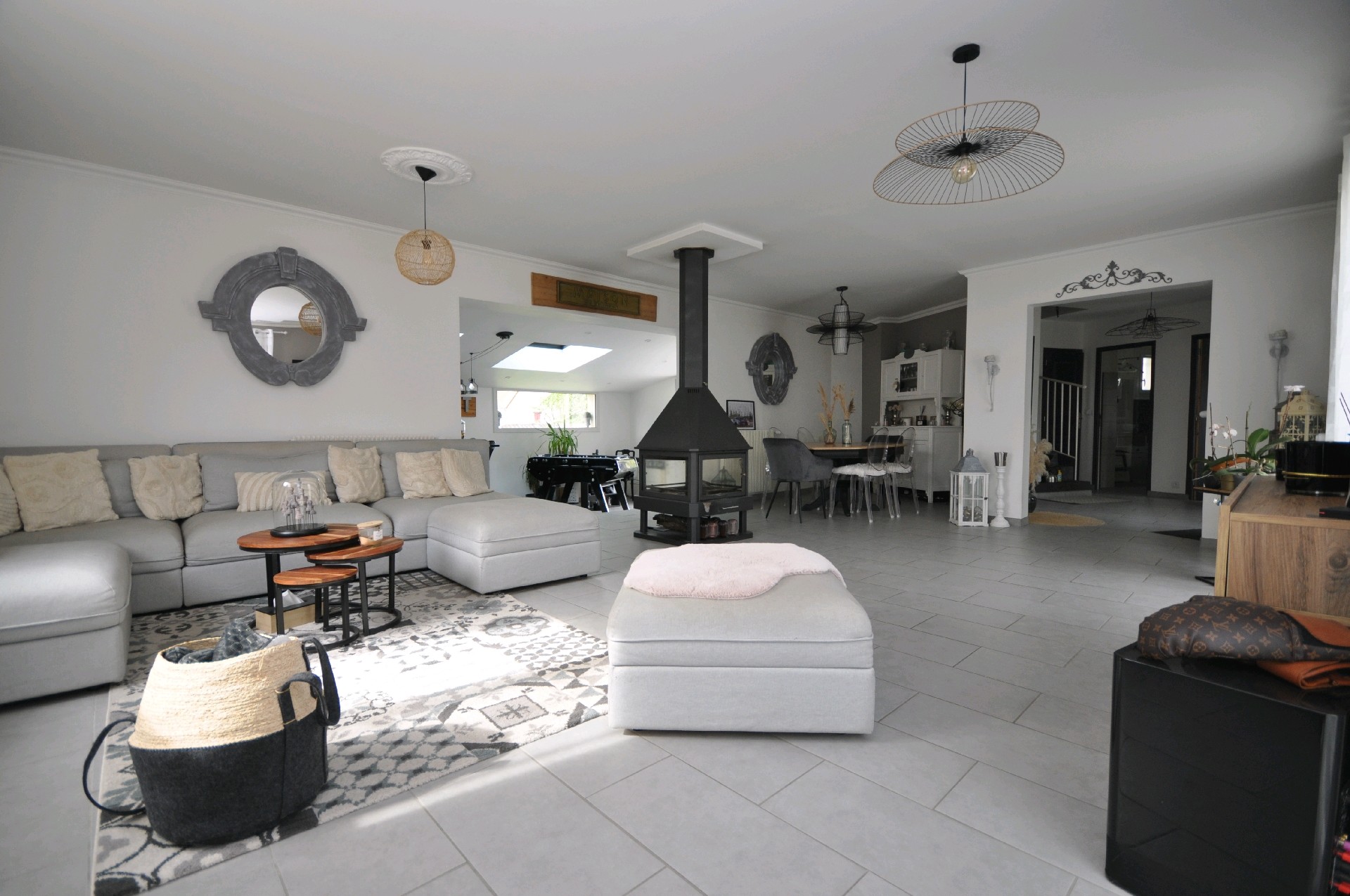 Située dans un environnement agréable, cette belle maison familiale (de construction traditionnelle), de 158 m² habitables offre de grands volumes et des prestations soignées. Elle se compose au rez de chaussée : d'une vaste entrée avec placards, un salon volumineux de 42 m² avec un poële à bois, ouvert sur une grande cuisine aménagée et équipée récente de 30 m² environ (soit un volume total très agréable de 70 m² environ) ouvrant sur 2 terrasses, une chambre ou bureau attenant à une salle de bains (baignoire