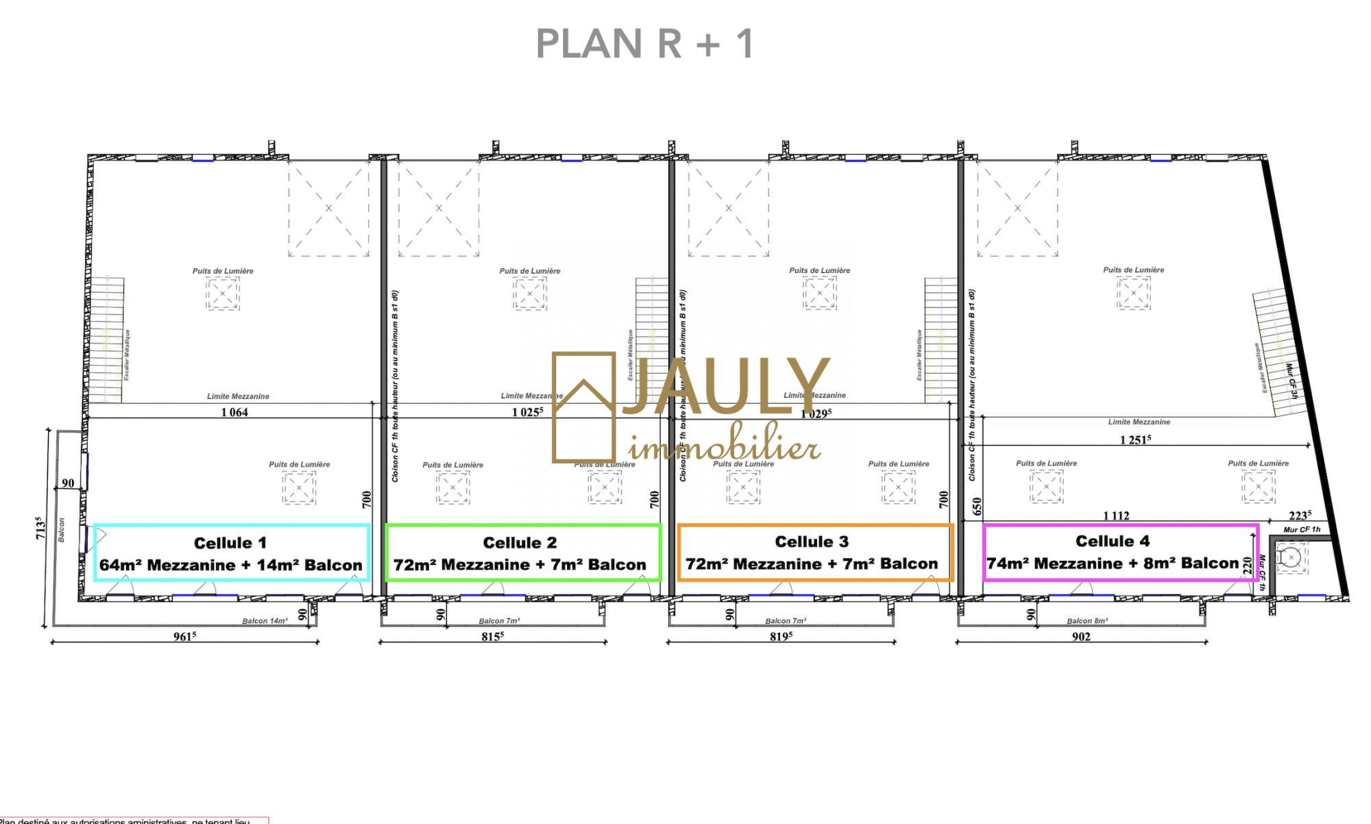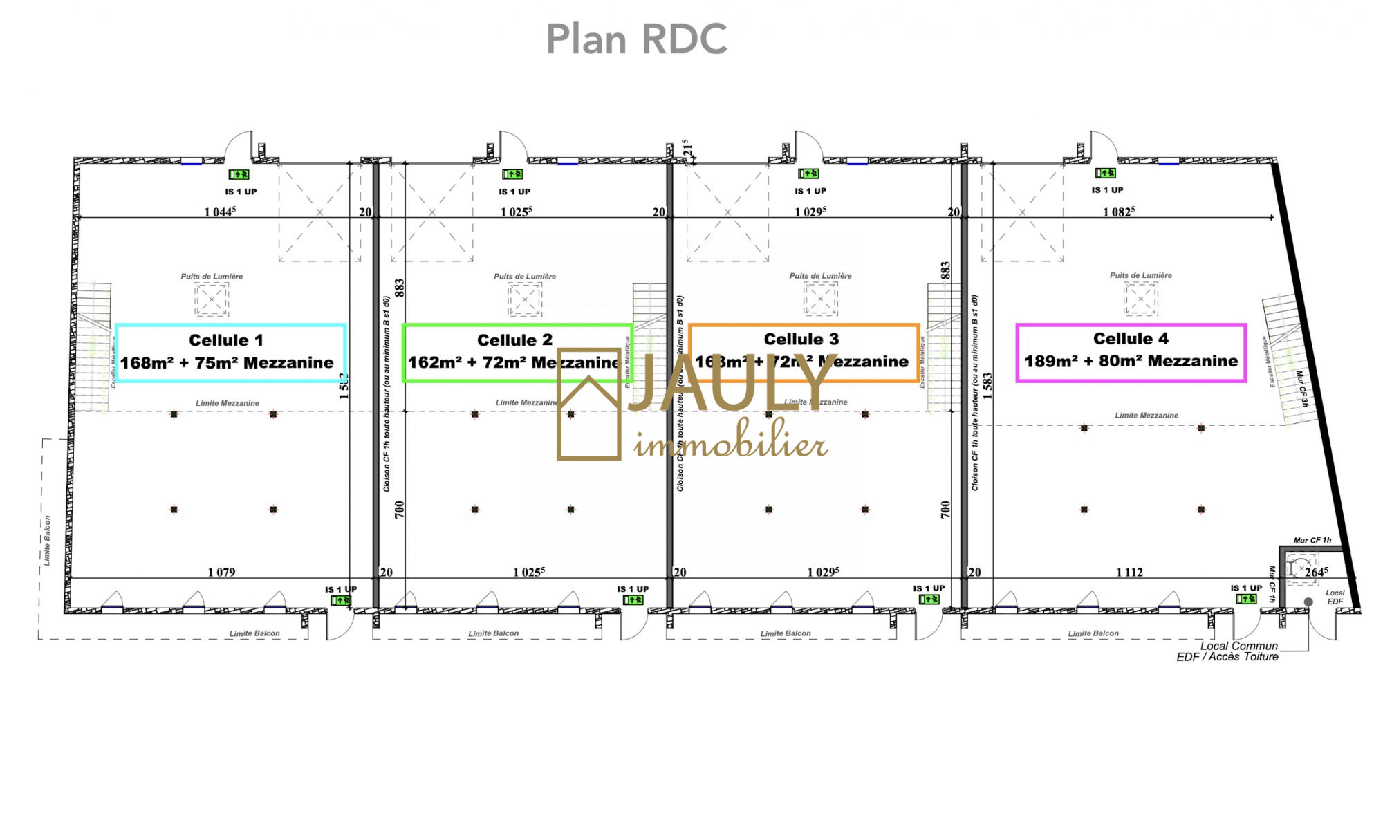 - Divisé en 4 cellules artisanales d'une surface comprise entre 234 et 269 m² comprenant une mezzanine + balcon