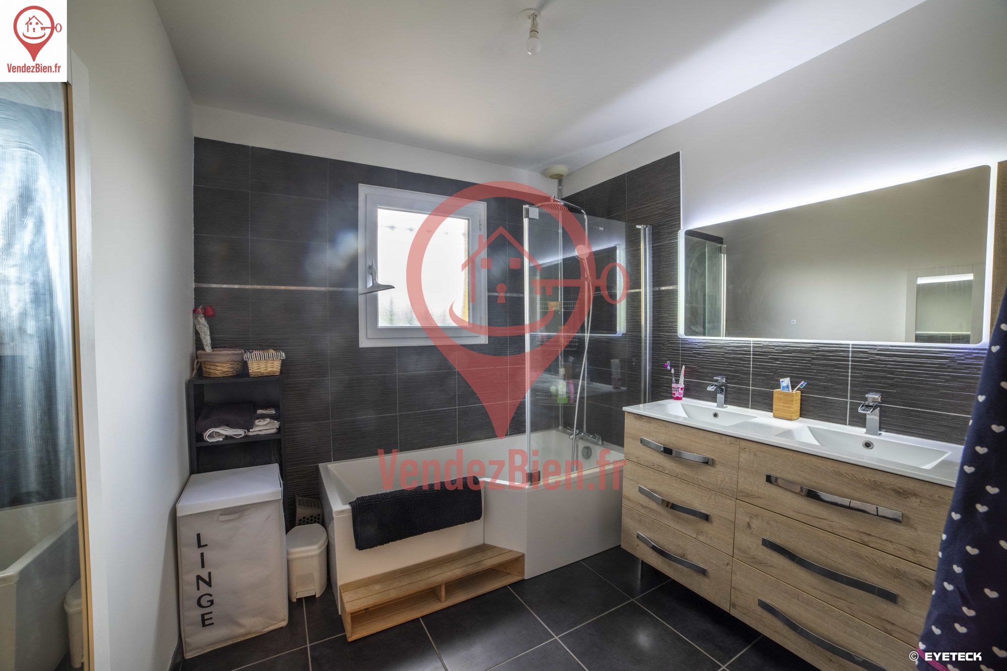 Le rez-de-chaussée propose également trois chambres avec rangements intégrés, une salle de bains équipée d'une double vasque et un WC indépendant.