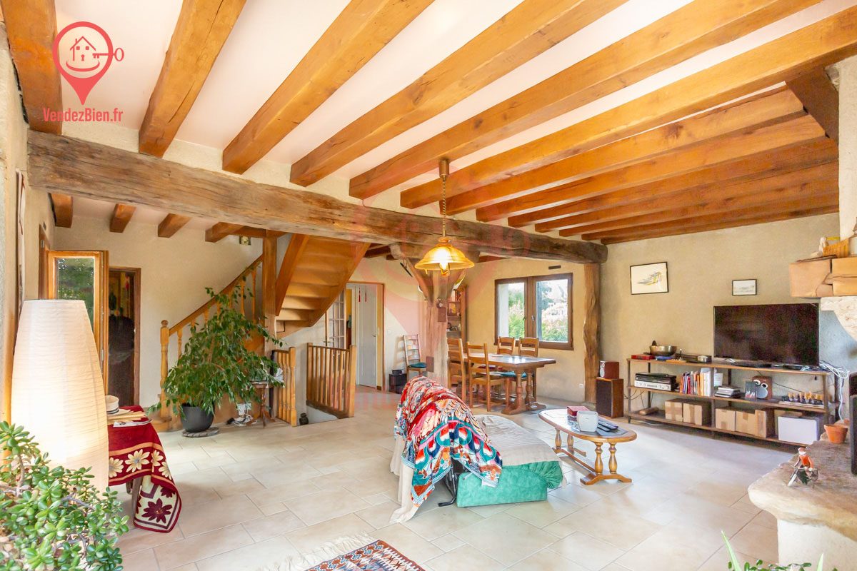 Sa pièce de vie ouverte sur l'extérieur est particulièrement spacieuse (43 m²). Elle est ornée de jolies poutres qui donnent du charme. Les murs sont enduits à la chaux (idéal pour laisser respirer les murs tout en assurant une parfaite isolation, tant en hiver qu'en été). La cheminée habille le salon et donne l'impression d'être dans un château.