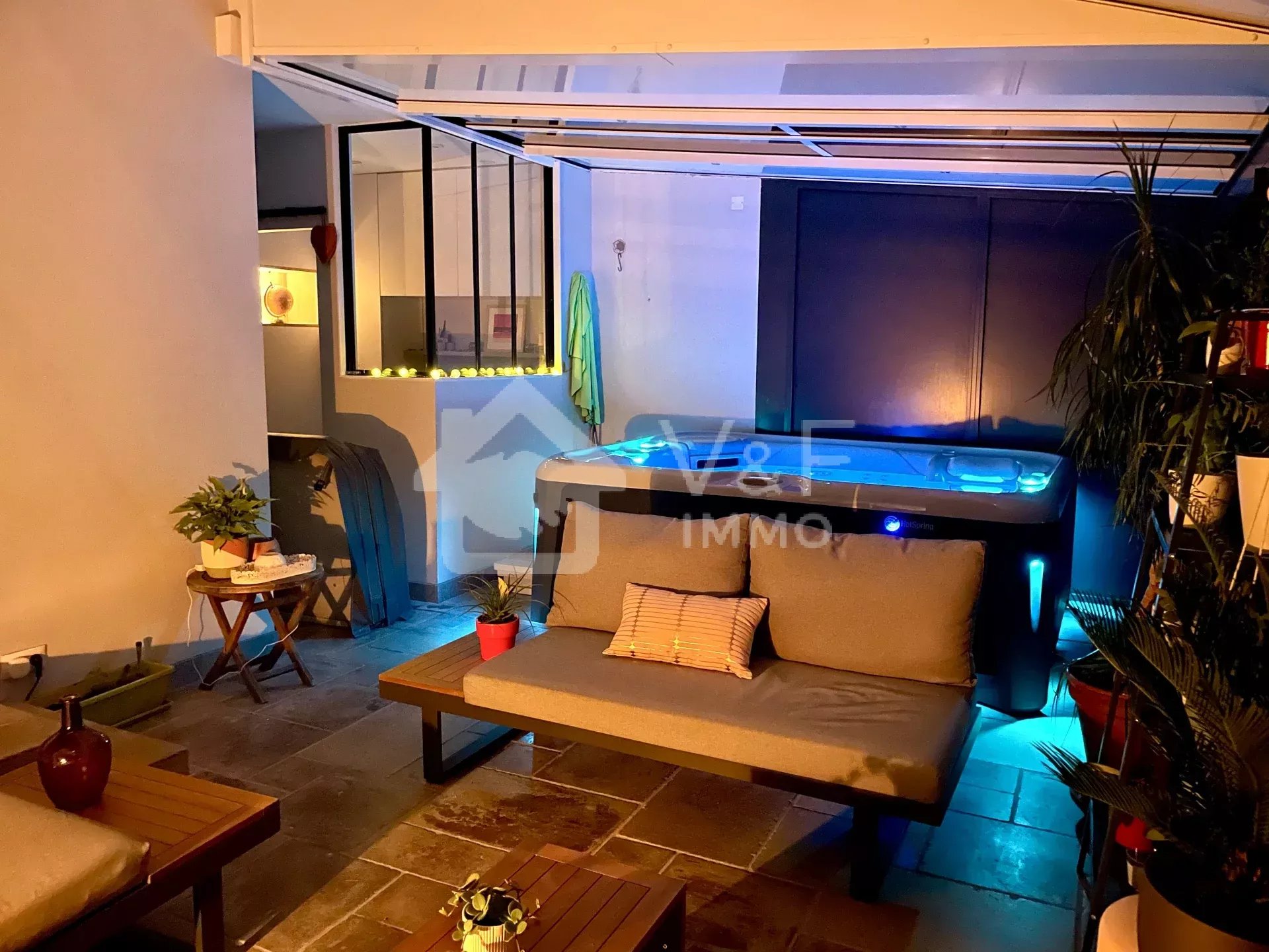 Entièrement rénovée .En poussant la porte vous découvrirez une grande pièce a vivre et sa cuisine ouverte entièrement équipée ,sa belle cheminée centrale ,et de nombreux rangements .Une joli véranda d'environ 28m² donnant sur jardin et piscine.