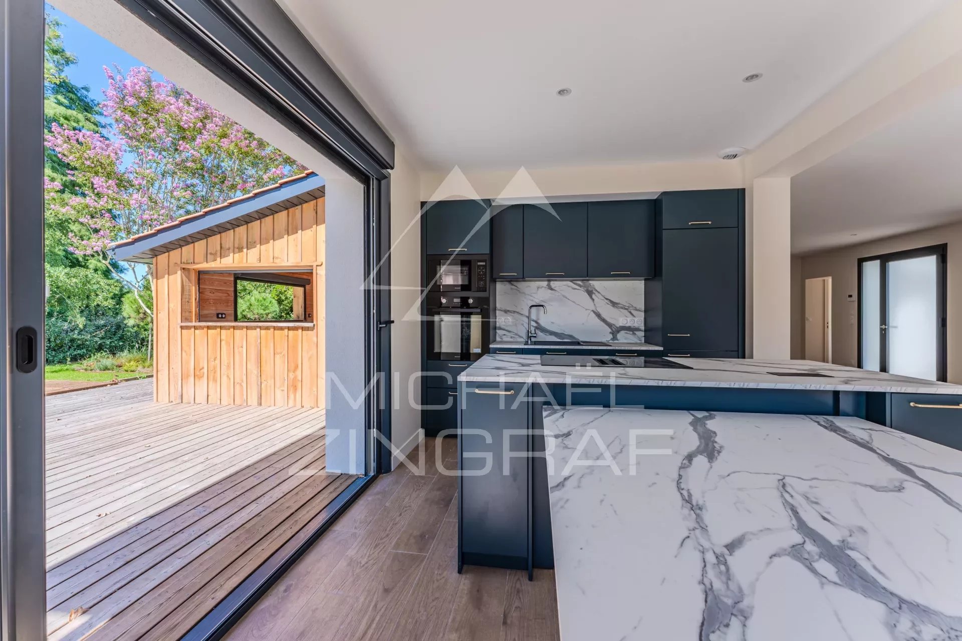 Michael Zingraf Real Estate – Bassin d’Arcachon vous propose de découvrir cette élégante villa située à La Teste-de-Buch, dans un environnement résidentiel recherché offrant calme, verdure et proximité avec les commodités du Bassin. Développant environ 147 m² habitables, cette propriété séduit par ses volumes équilibrés, sa belle luminosité et la qualité de ses aménagements, offrant un cadre de vie agréable aussi bien en résidence principale qu’en maison de vacances. Le rez-de-chaussée s’articule autour d’un vaste espace de vie convivial, composé d’un salon et d’une salle à manger ouverts sur une cuisine contemporaine entièrement aménagée et équipée. Cet espace, baigné de lumière, bénéficie d’une circulation fluide vers les extérieurs et se prolonge par un cellier fonctionnel. Ce niveau accueille également une suite parentale avec salle d’eau privative, garantissant confort et intimité. Un bureau, pouvant être utilisé comme espace de travail ou chambre d’appoint, ainsi qu’une seconde salle d’eau avec toilettes complètent cet étage et offrent une grande souplesse d’aménagement. À l’étage, l’espace nuit comprend deux chambres spacieuses, accompagnées d’une salle de bains et de toilettes indépendantes, formant un ensemble parfaitement adapté à une vie familiale ou à l’accueil d’invités. À l’extérieur, la maison est implantée sur un terrain paysager d’environ 1 130 m², offrant de beaux espaces de détente. Le jardin accueille une piscine, idéale pour profiter des journées ensoleillées, ainsi qu’un terrain de pétanque propice aux moments de convivialité. Les différents espaces extérieurs permettent de profiter pleinement de la douceur de vivre du Bassin. Alliant prestations de qualité, volumes harmonieux et cadre résidentiel privilégié, cette villa représente une belle opportunité sur le secteur recherché de La Teste-de-Buch, à proximité du Bassin d’Arcachon.