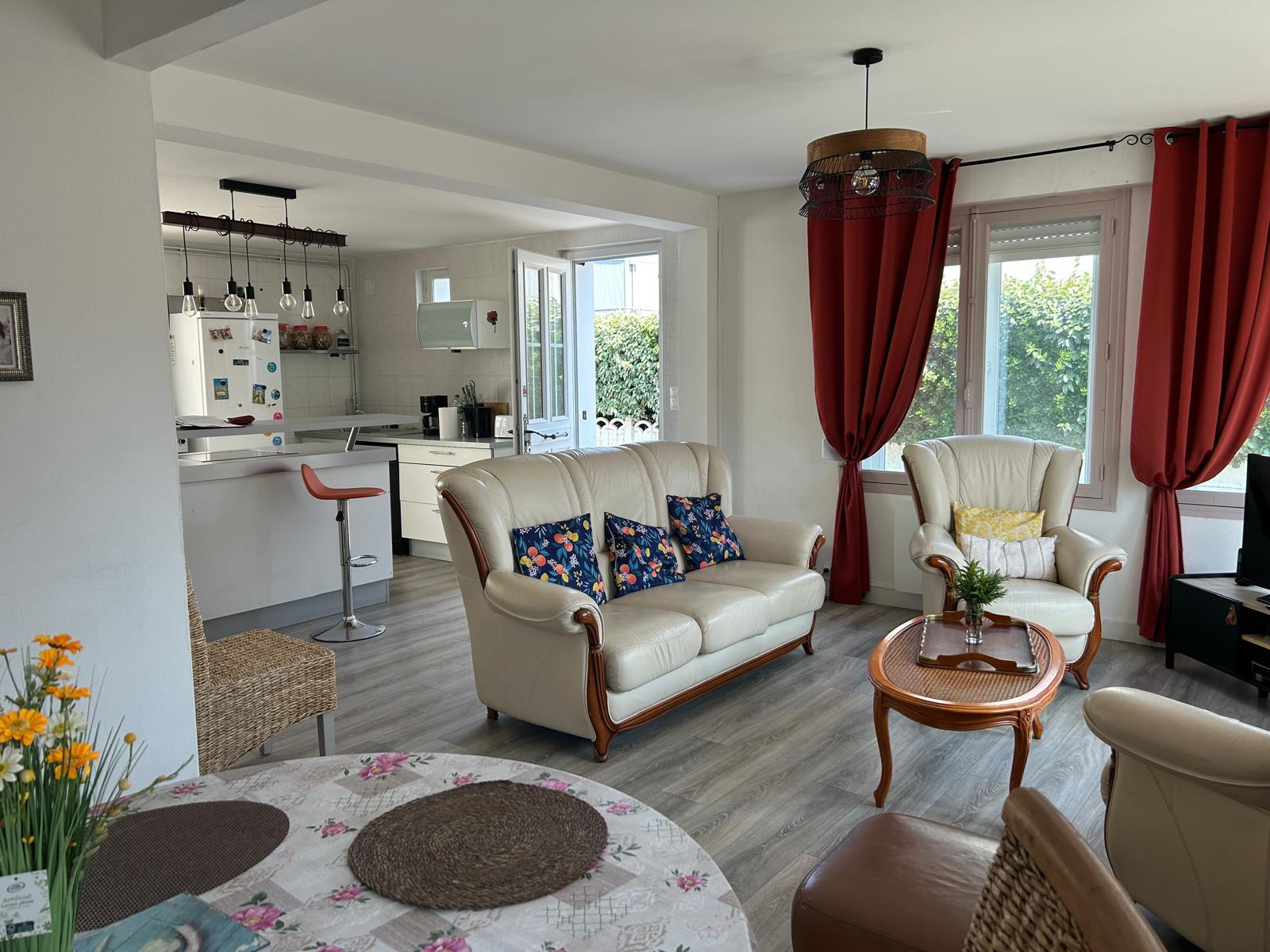 Maison de plain pied de 73.50 m2 + véranda de 19 m2 comprenant : Entrée suir séjour-salon et son poêle à Granulé ouvert suir cuisine équipée, wc, salle d'eau, deux chambres.